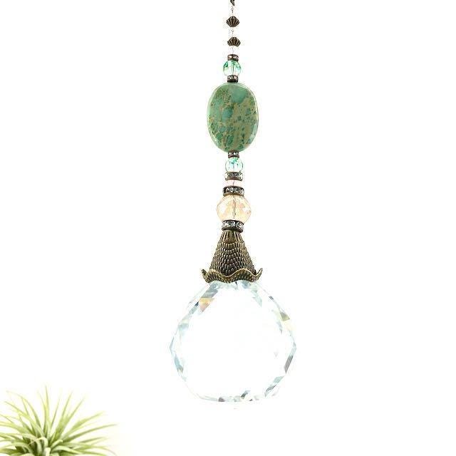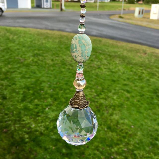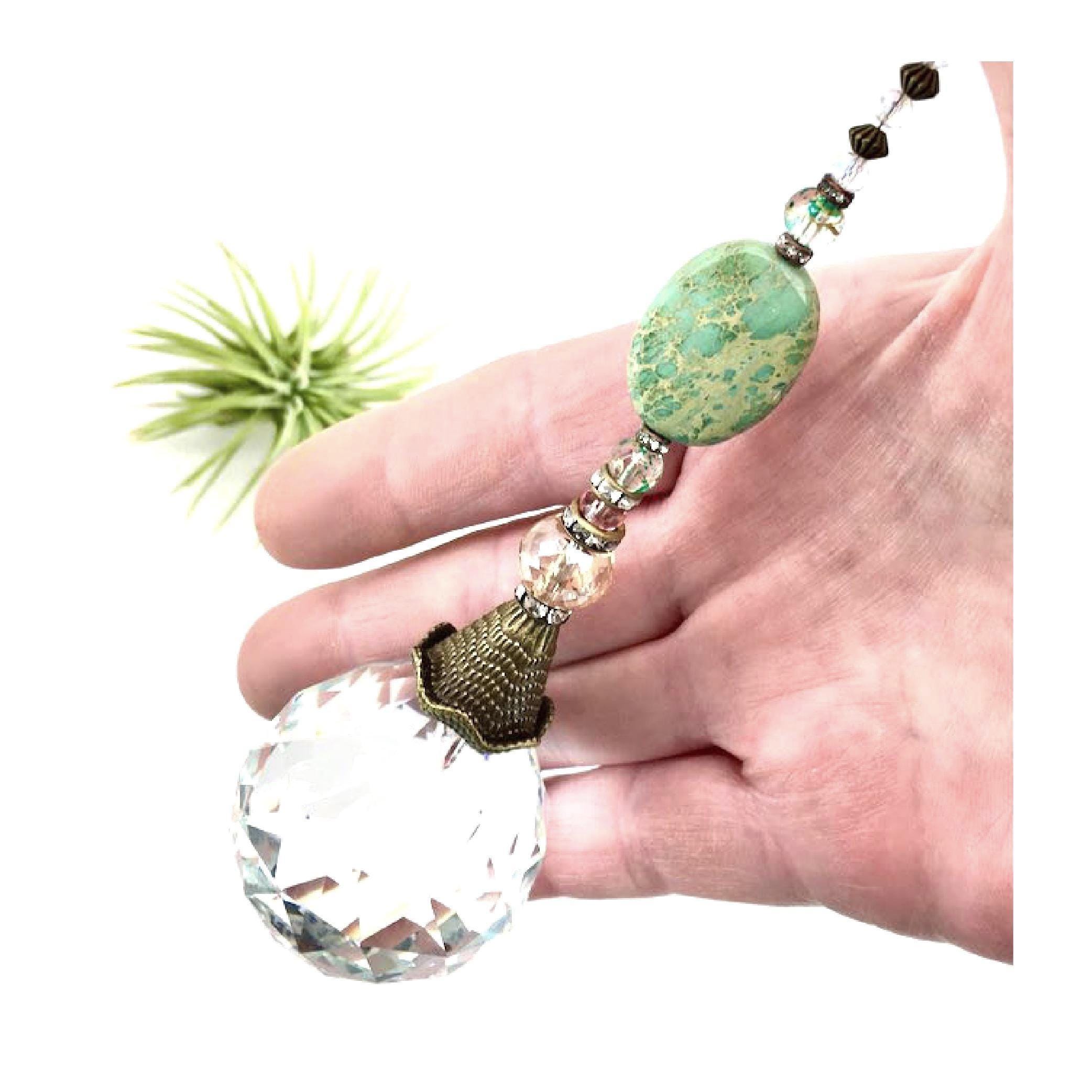 We dug into our favorite stash of gemstone beads to make this beautiful ornate crystal sun catcher, featuring unique Sea Sediment Jasper gemstone, and Czech glass beads. Lovely tones when light shines through.