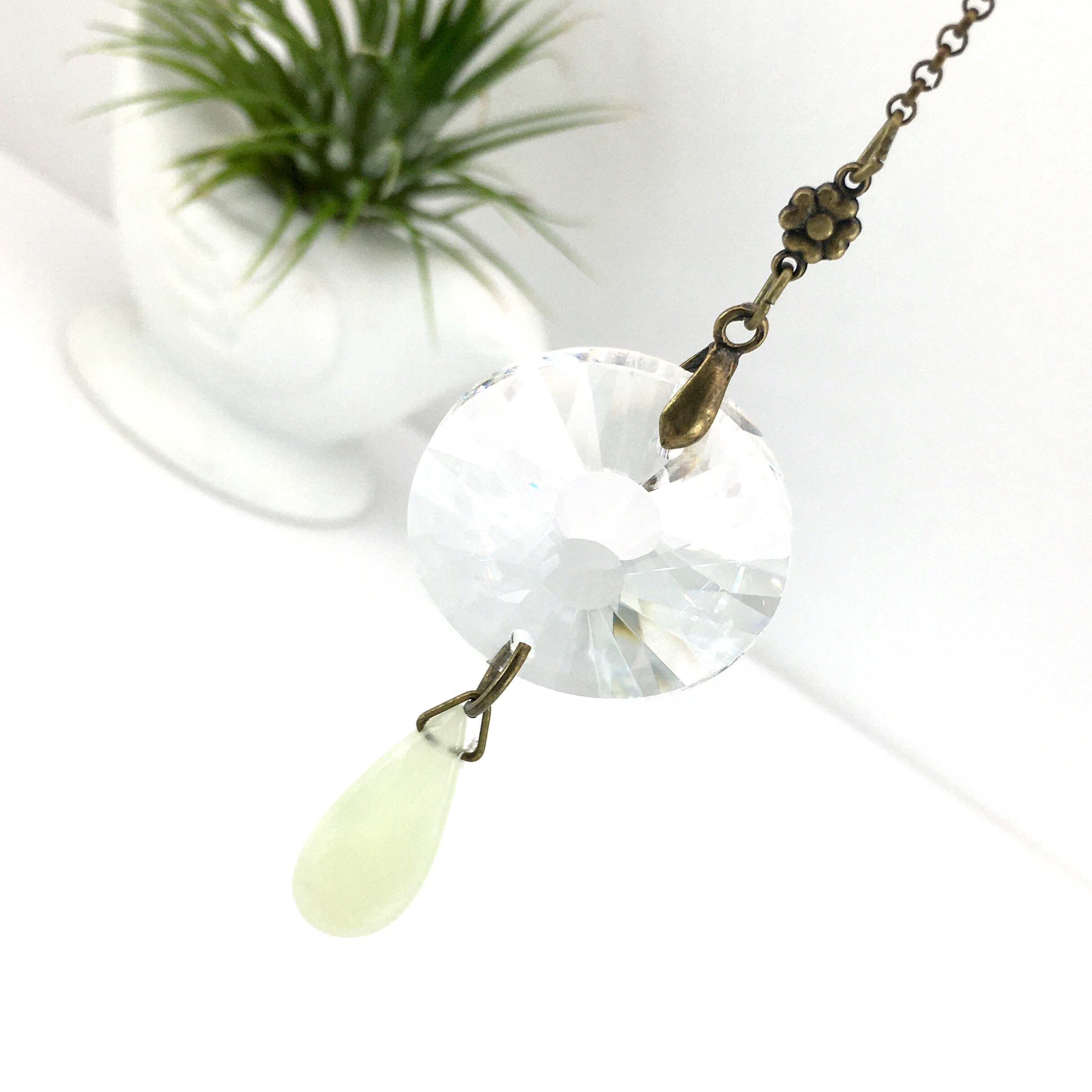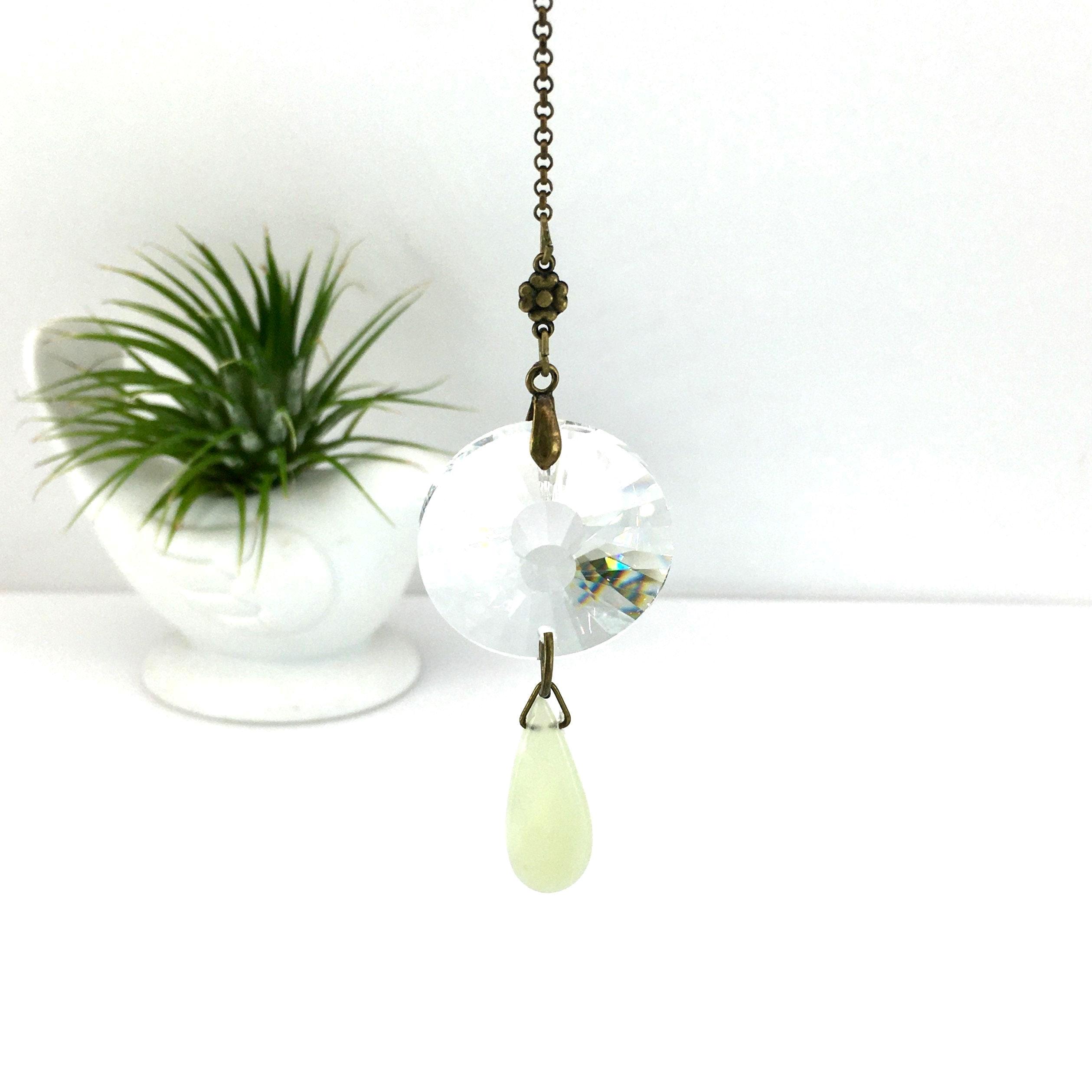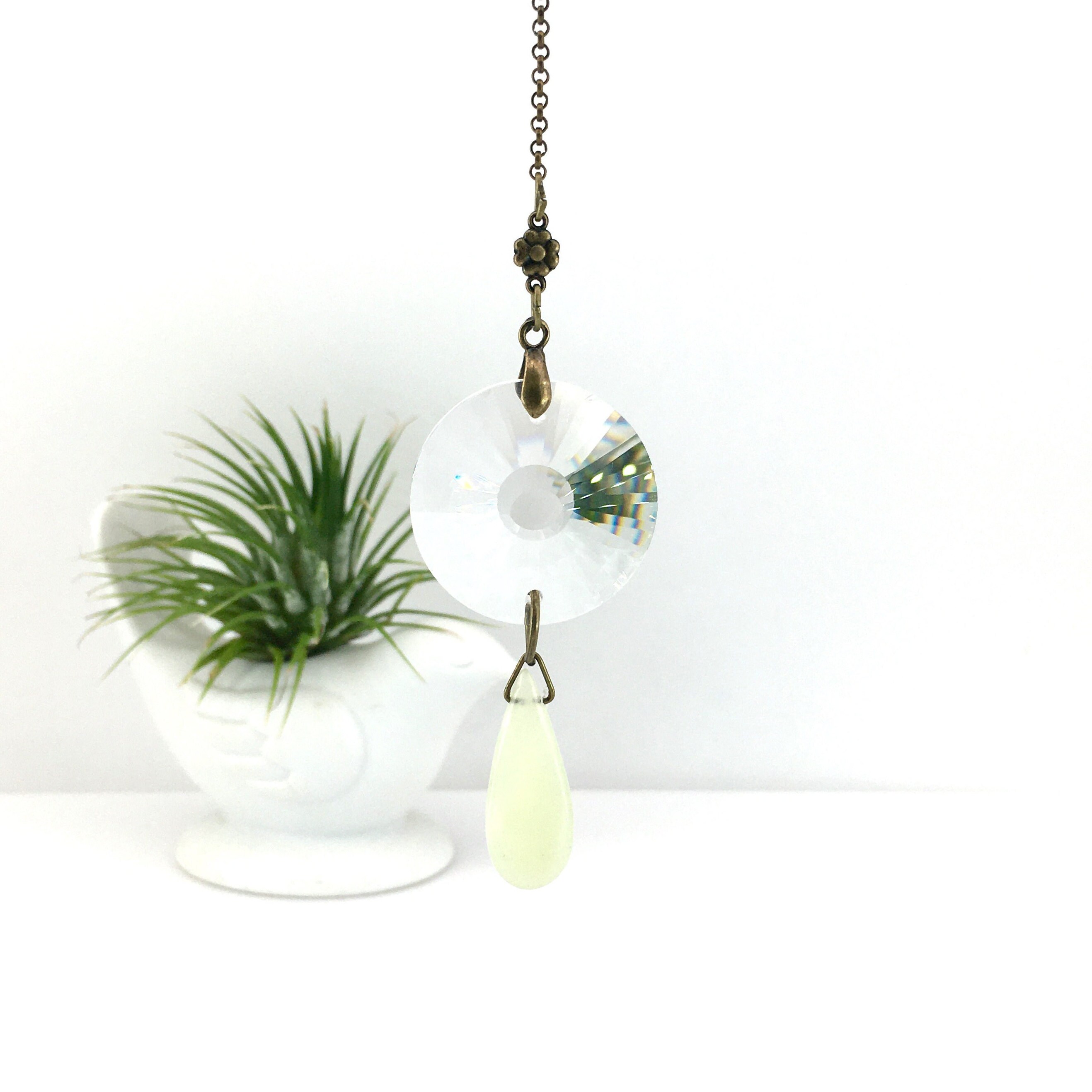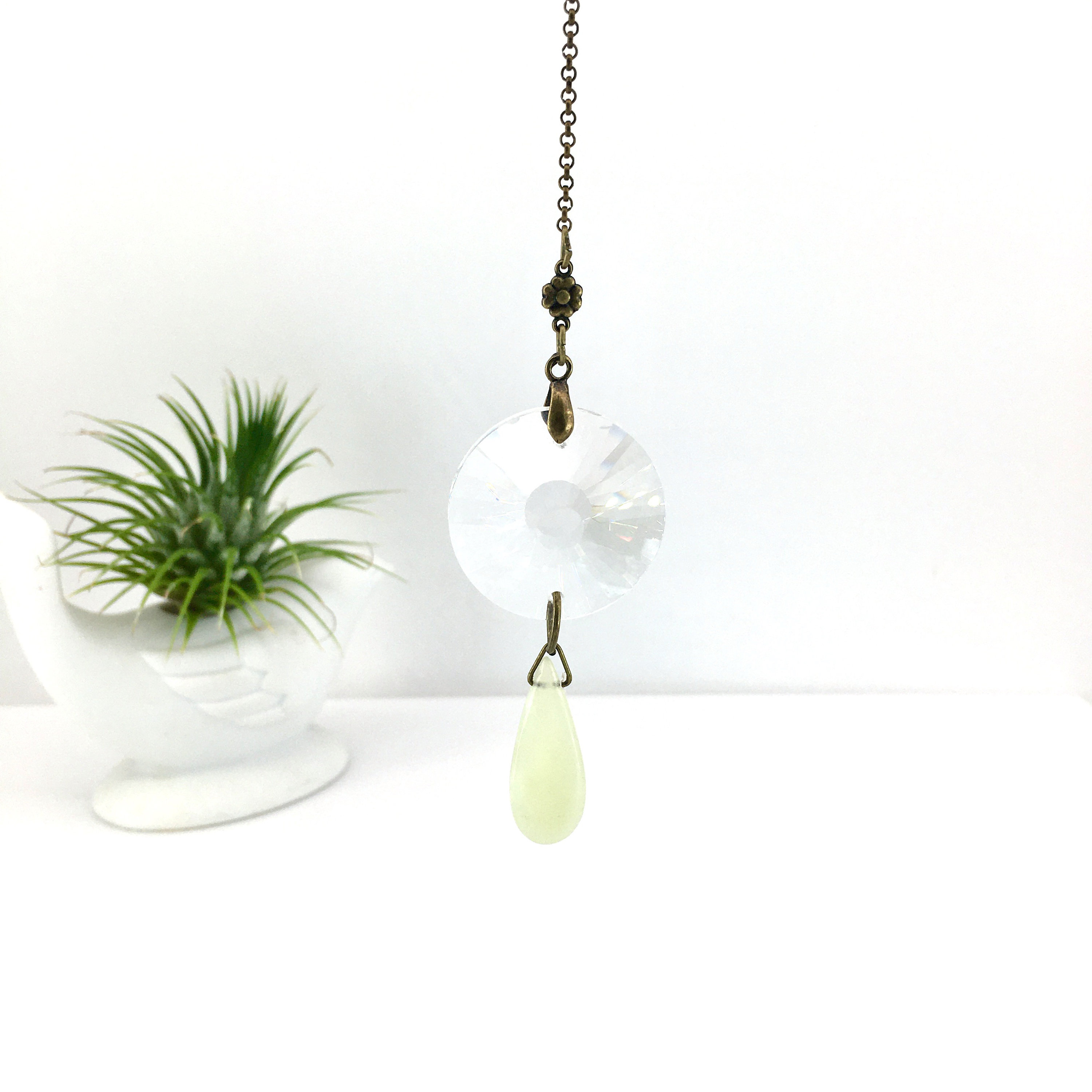 The focal is a high-quality Asfour 30mm crystal, renowned for casting rainbows and reflections that dance across the room. Beautiful Jade gemstone drop, thoughtfully strung together and finished with a versatile chain for easy hanging in a variety of spaces, from your car's rearview mirror to a cozy corner of your home.