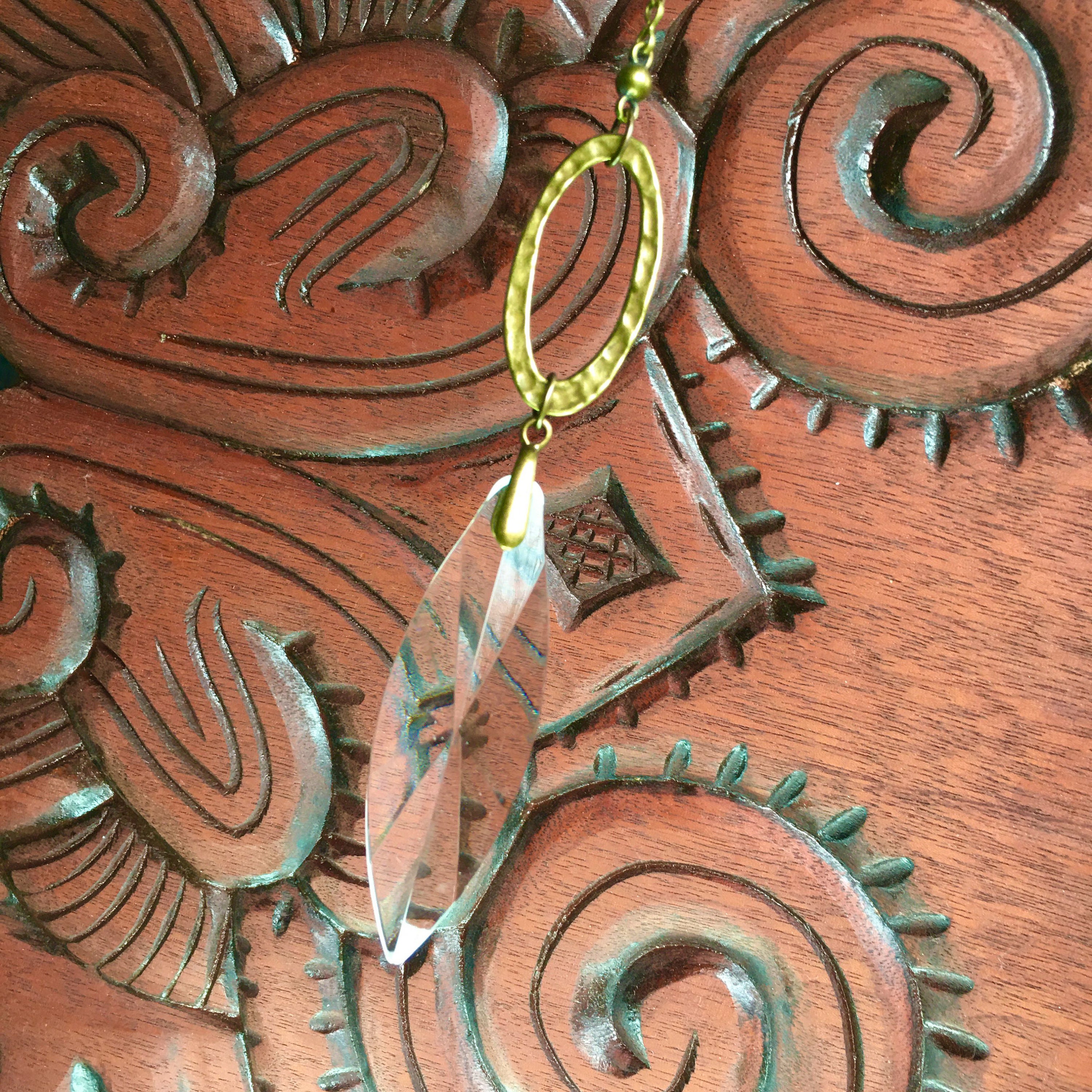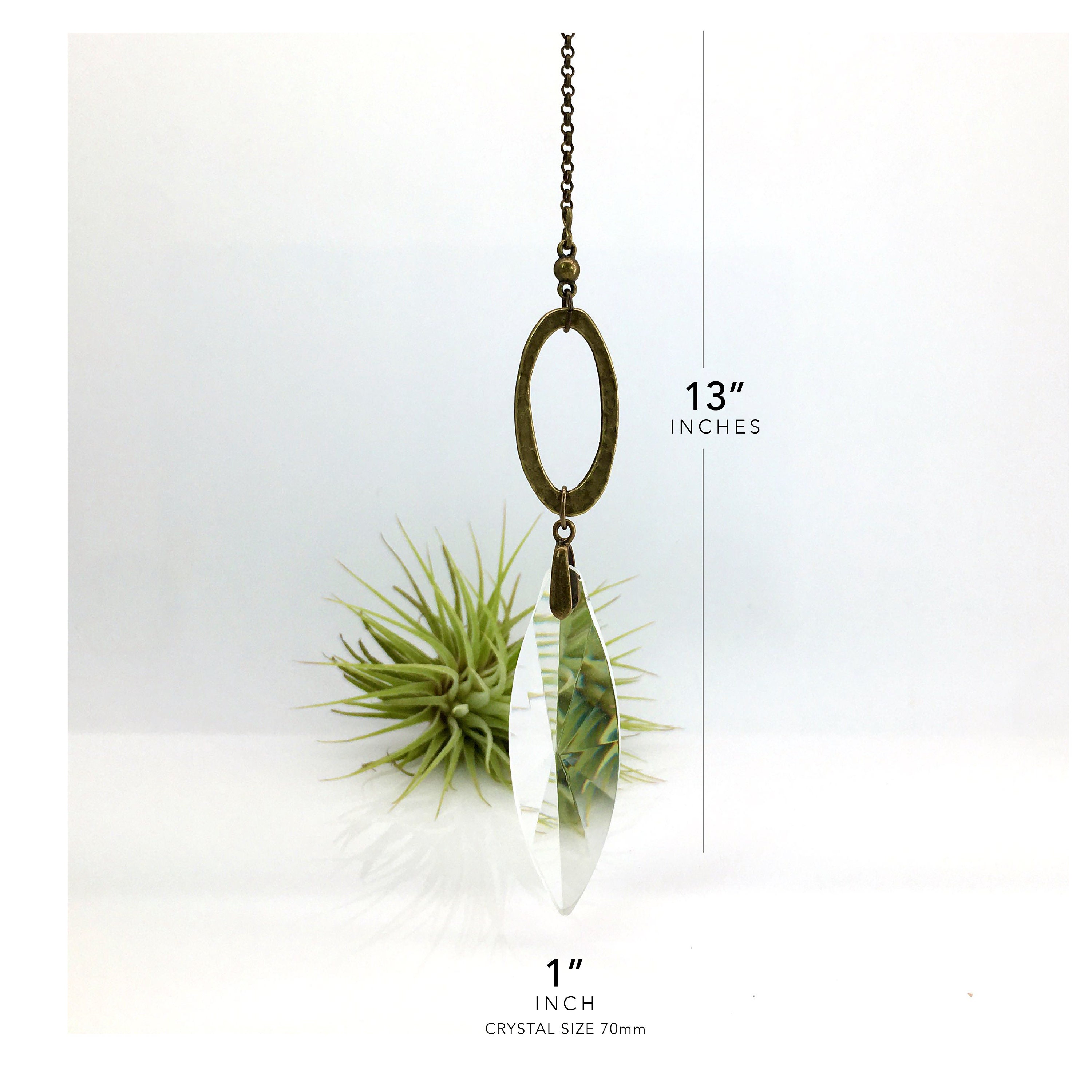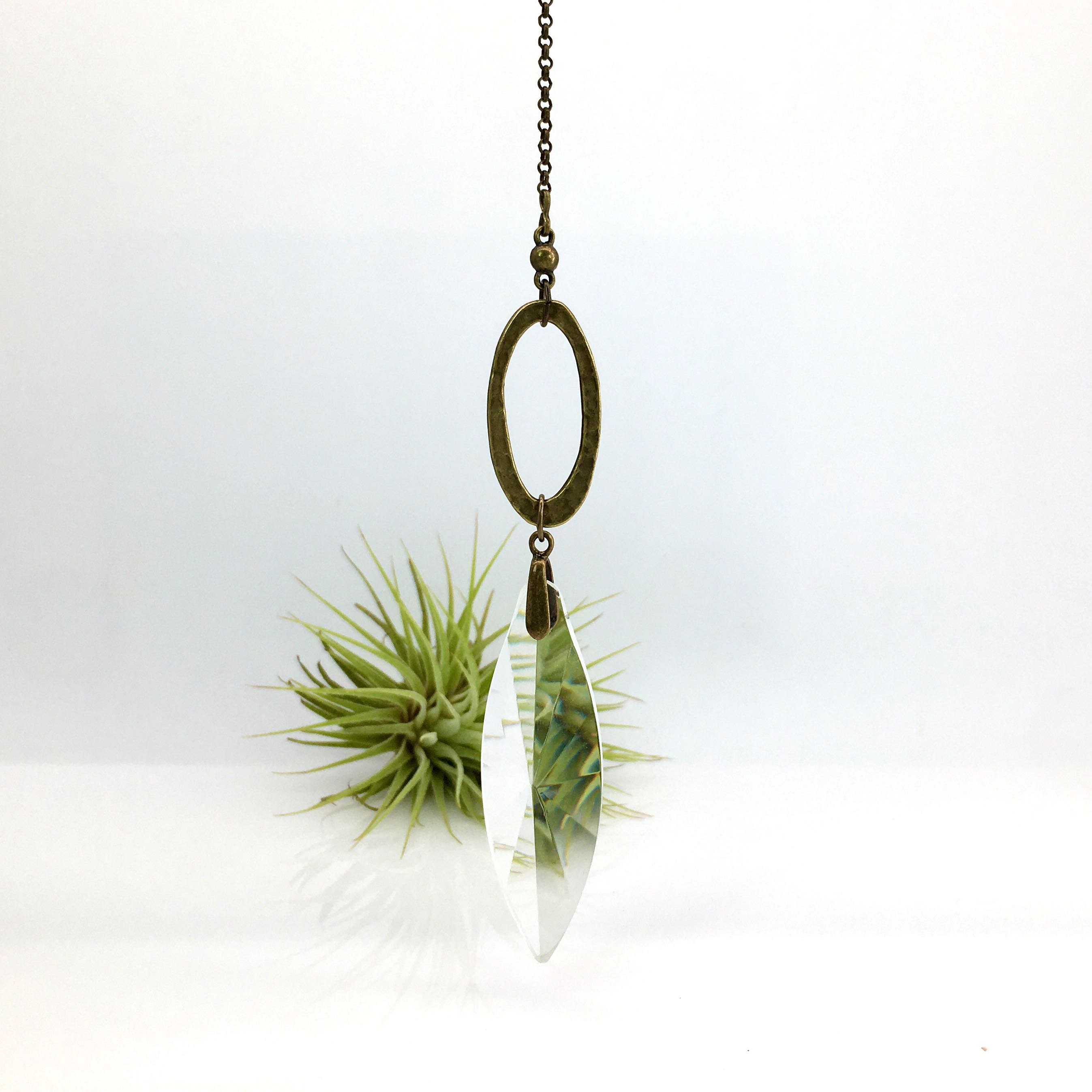 Simplistic in our unique hand made design, made with high-quality craftsmanship faceted crystal prism (70mm, 3"x1" Inch Crystal) carefully hand strung with simple hammered bronze focal to give an irresistible appearance.