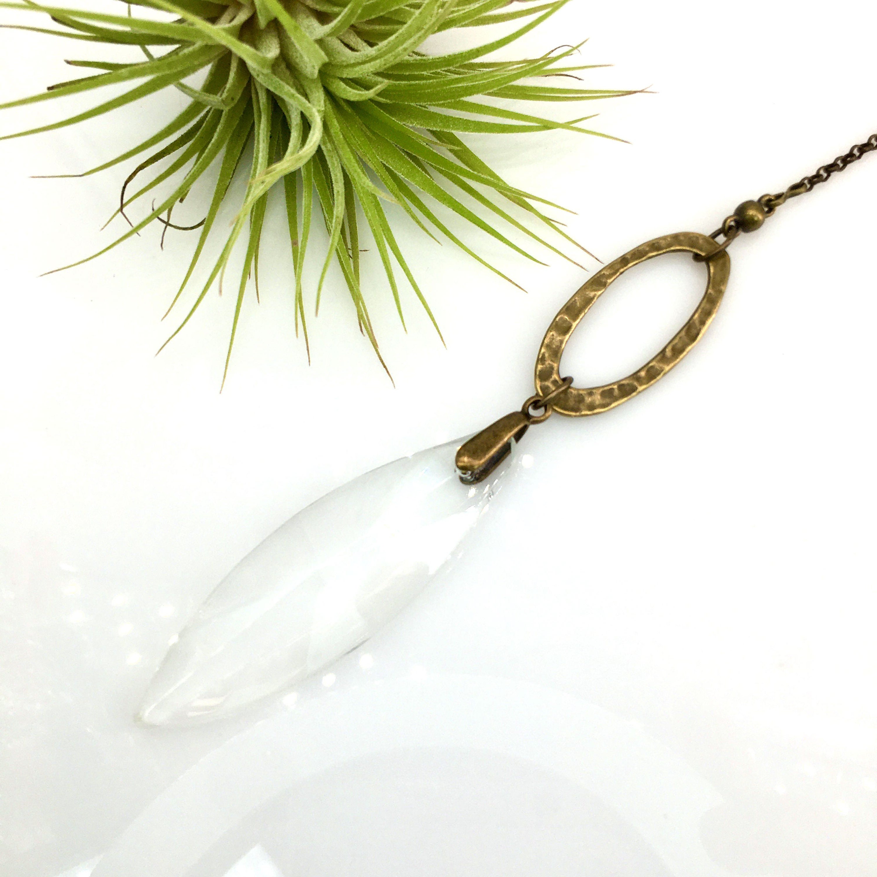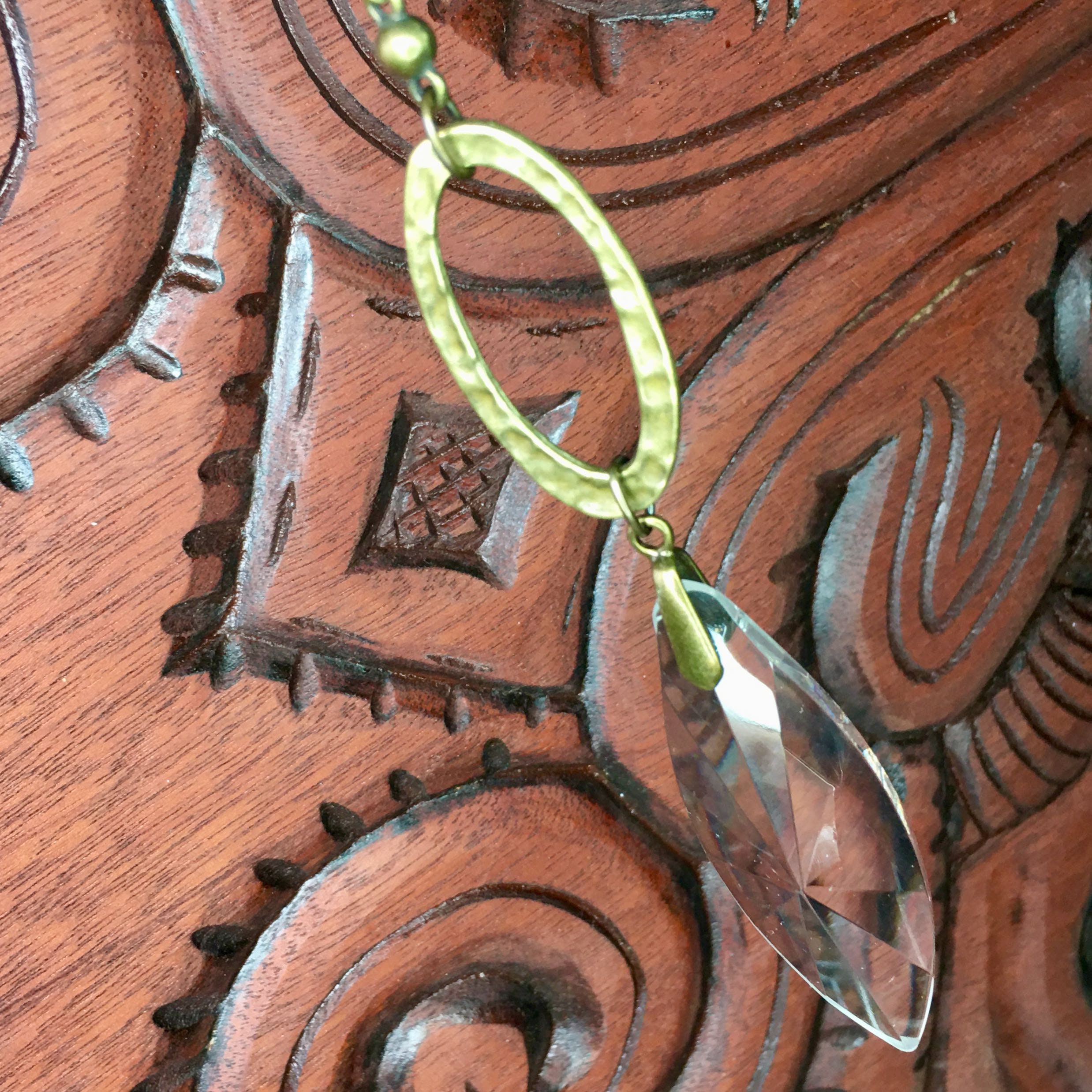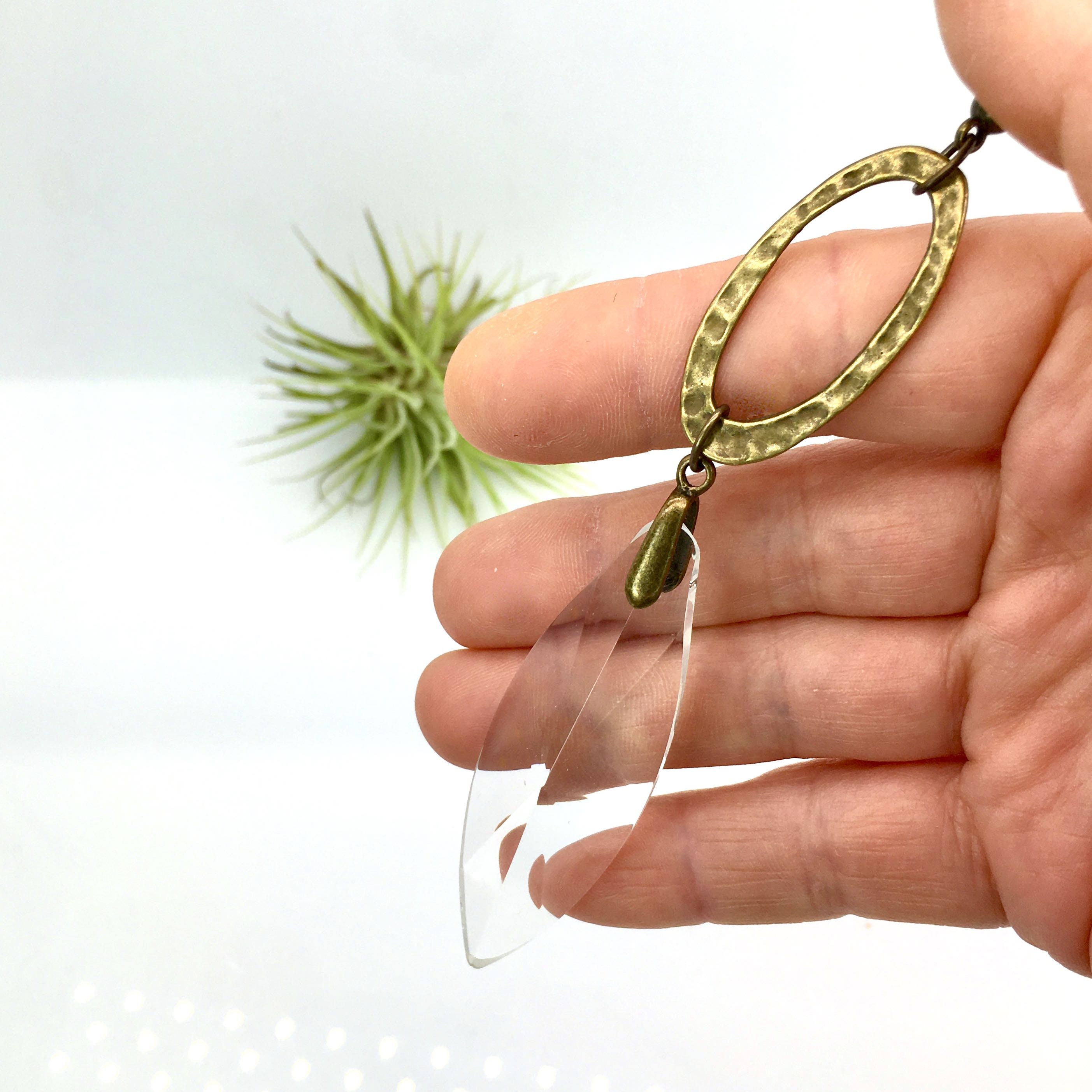 Simplistic in our unique hand made design, made with high-quality craftsmanship faceted crystal prism (70mm, 3"x1" Inch Crystal) carefully hand strung with simple hammered bronze focal to give an irresistible appearance.