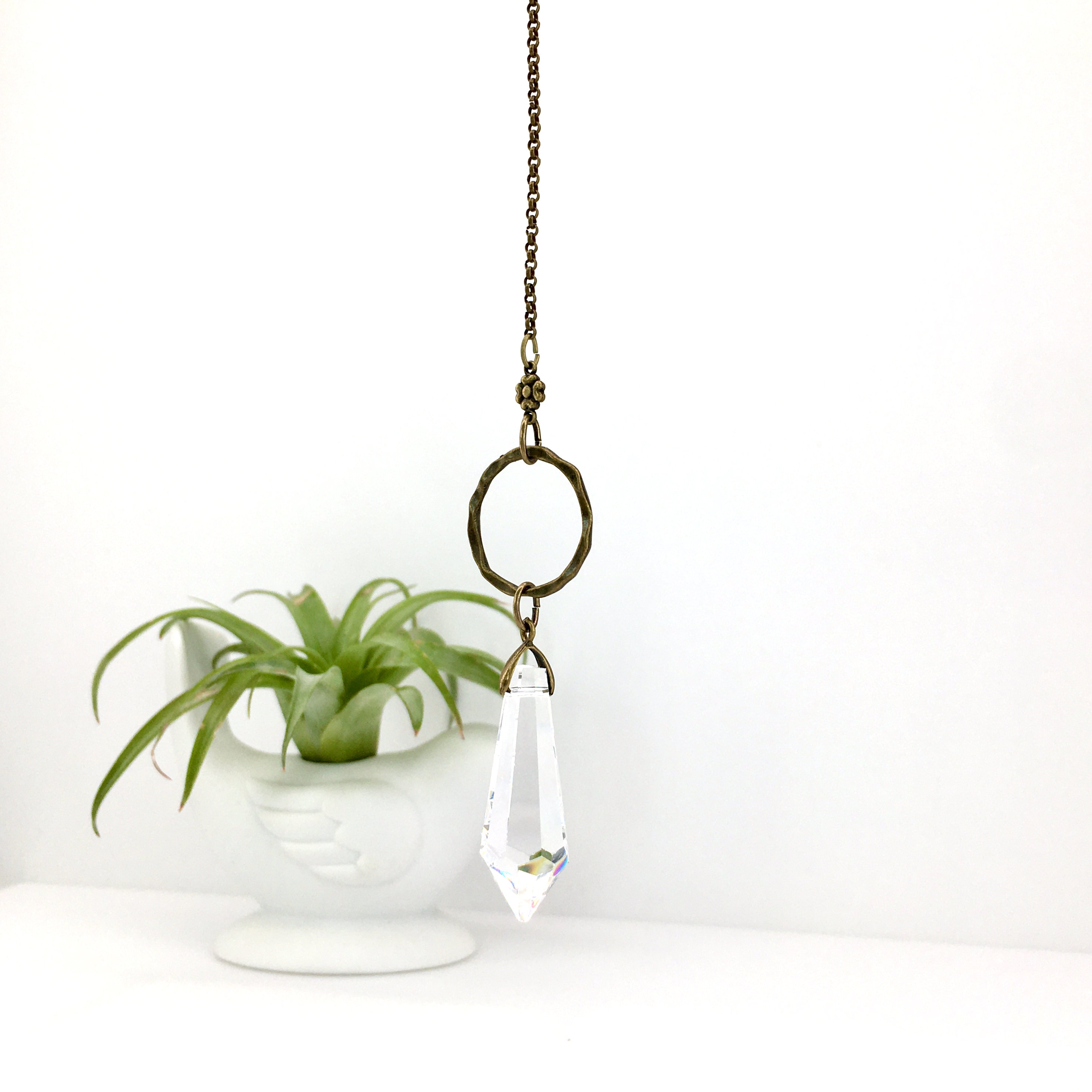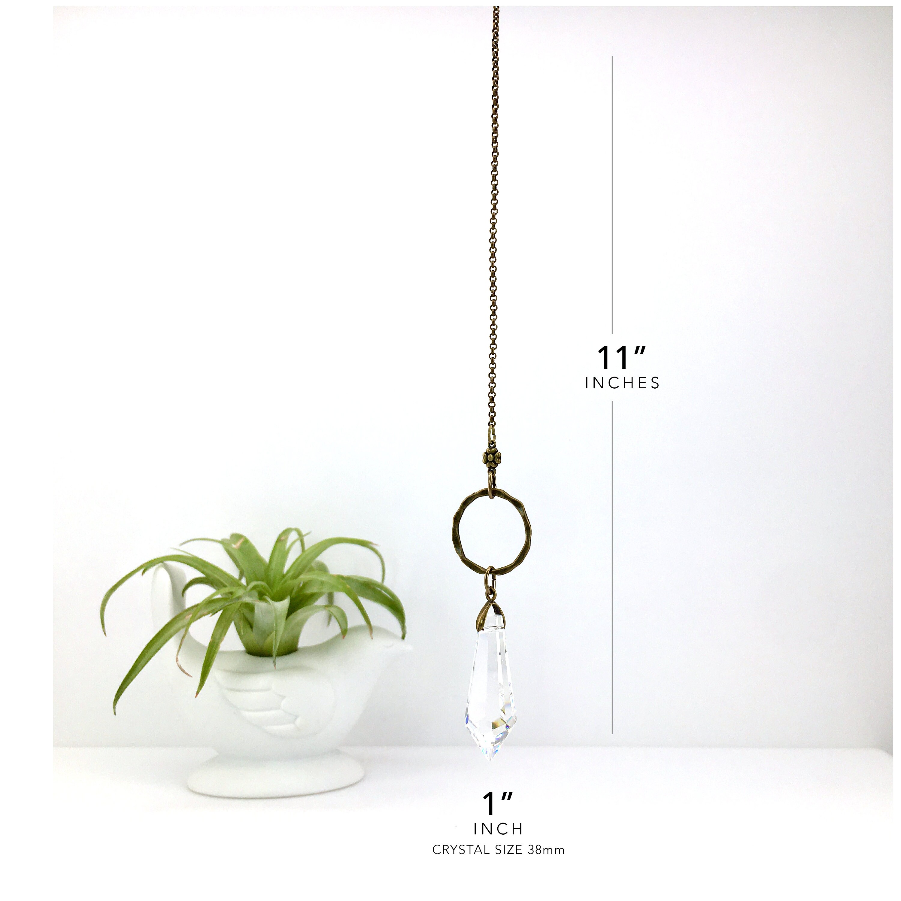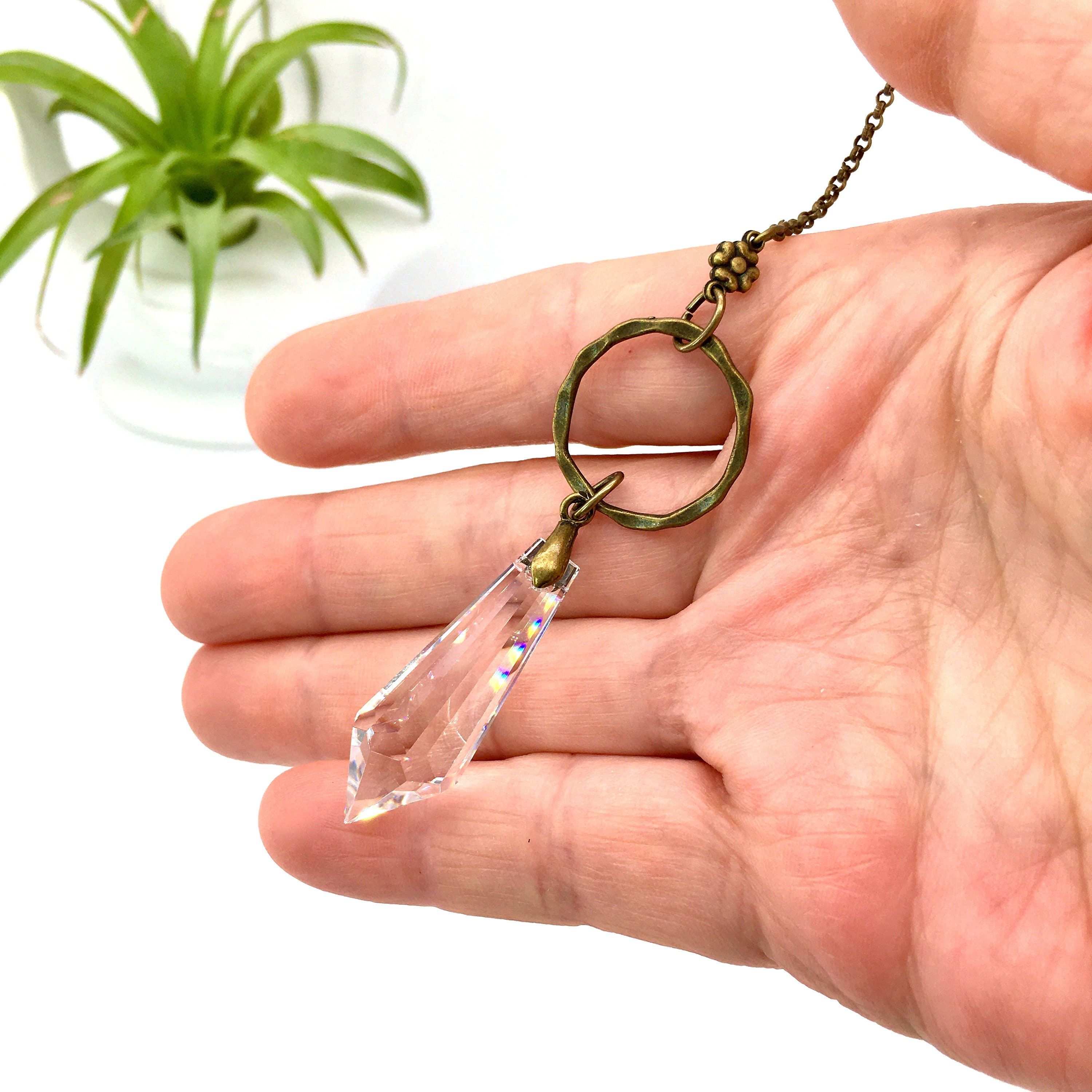 Simplistic in our unique hand made design, made with high-quality Asfour crystal prism (38mm) carefully hand strung with simple hammered bronze focal to give an irresistible appearance.
