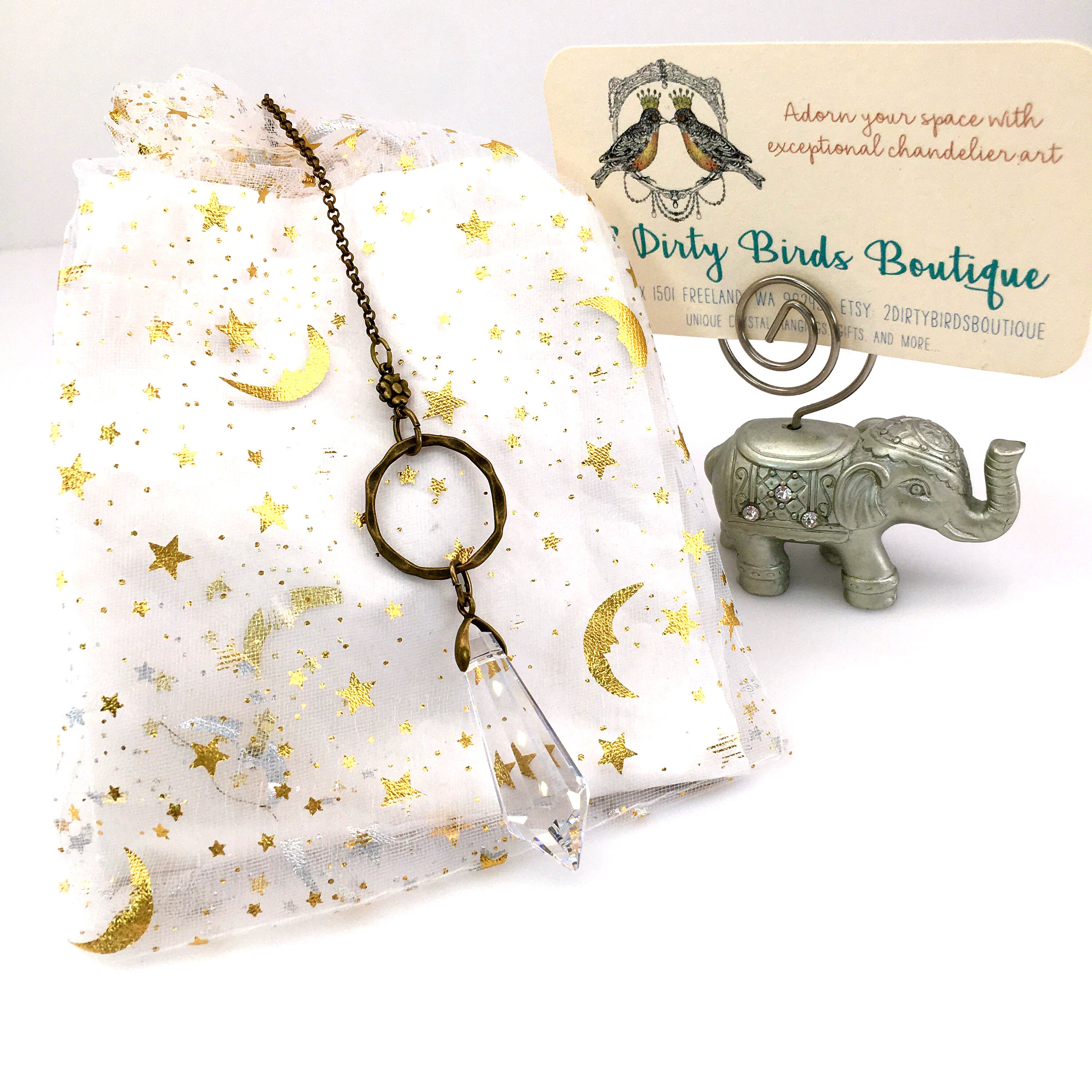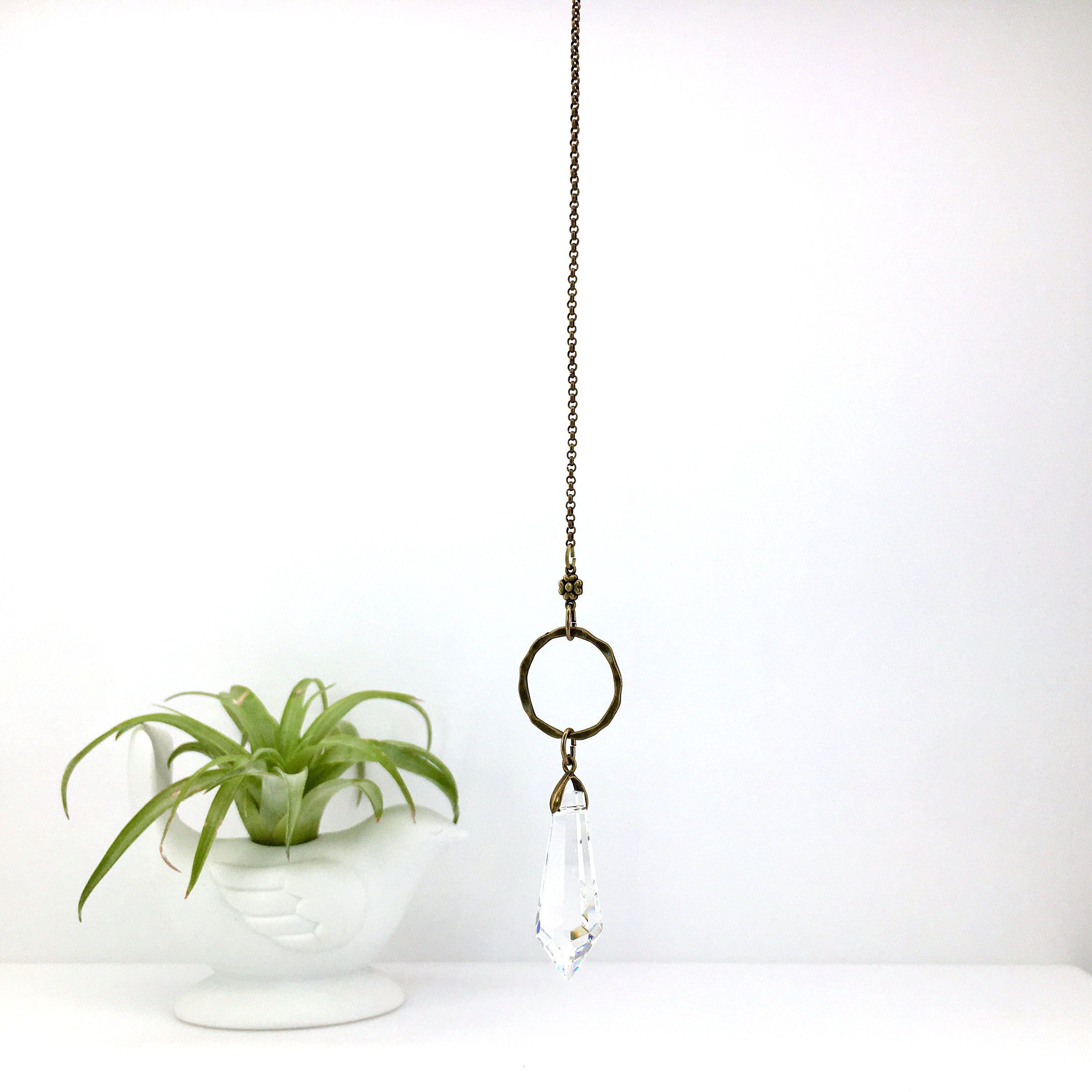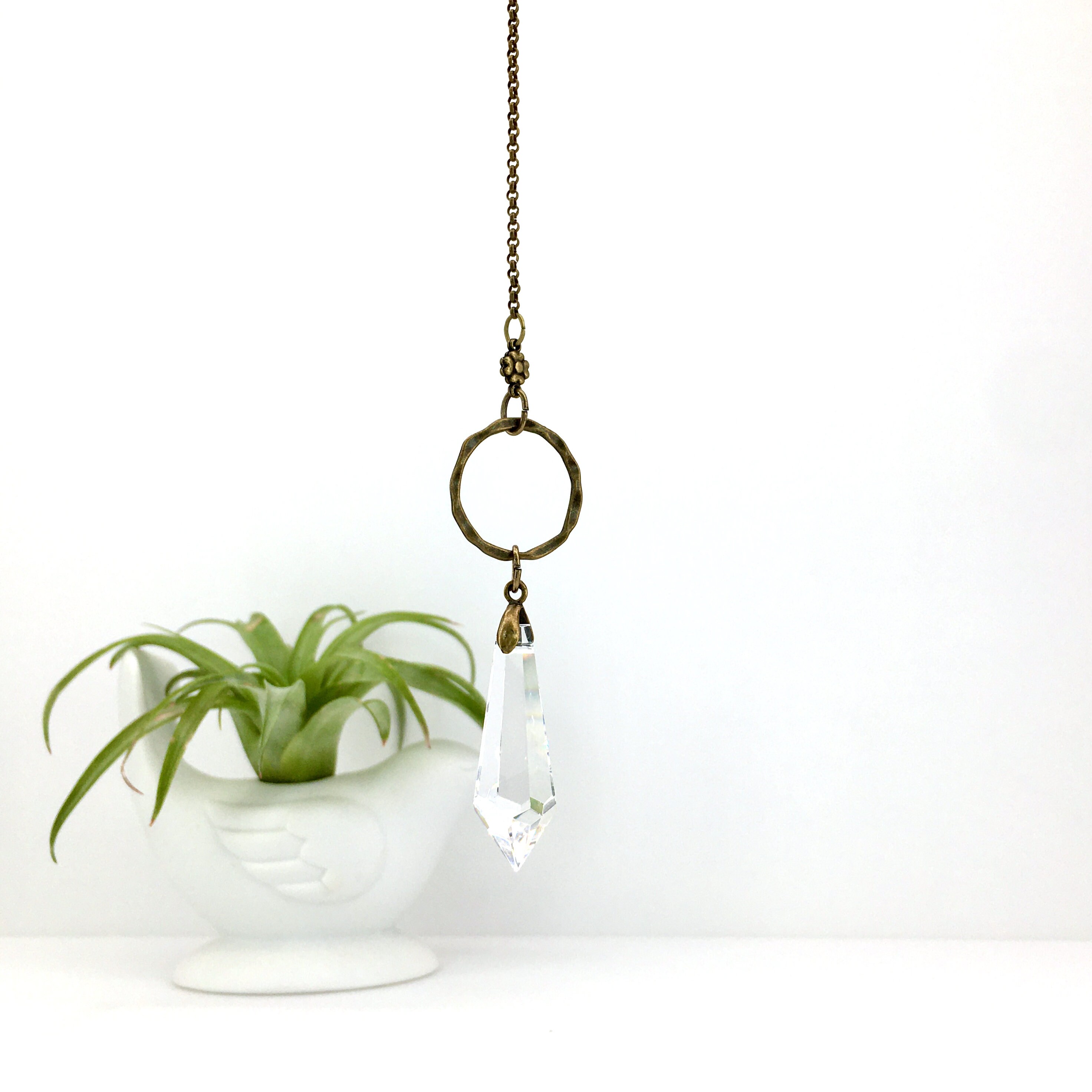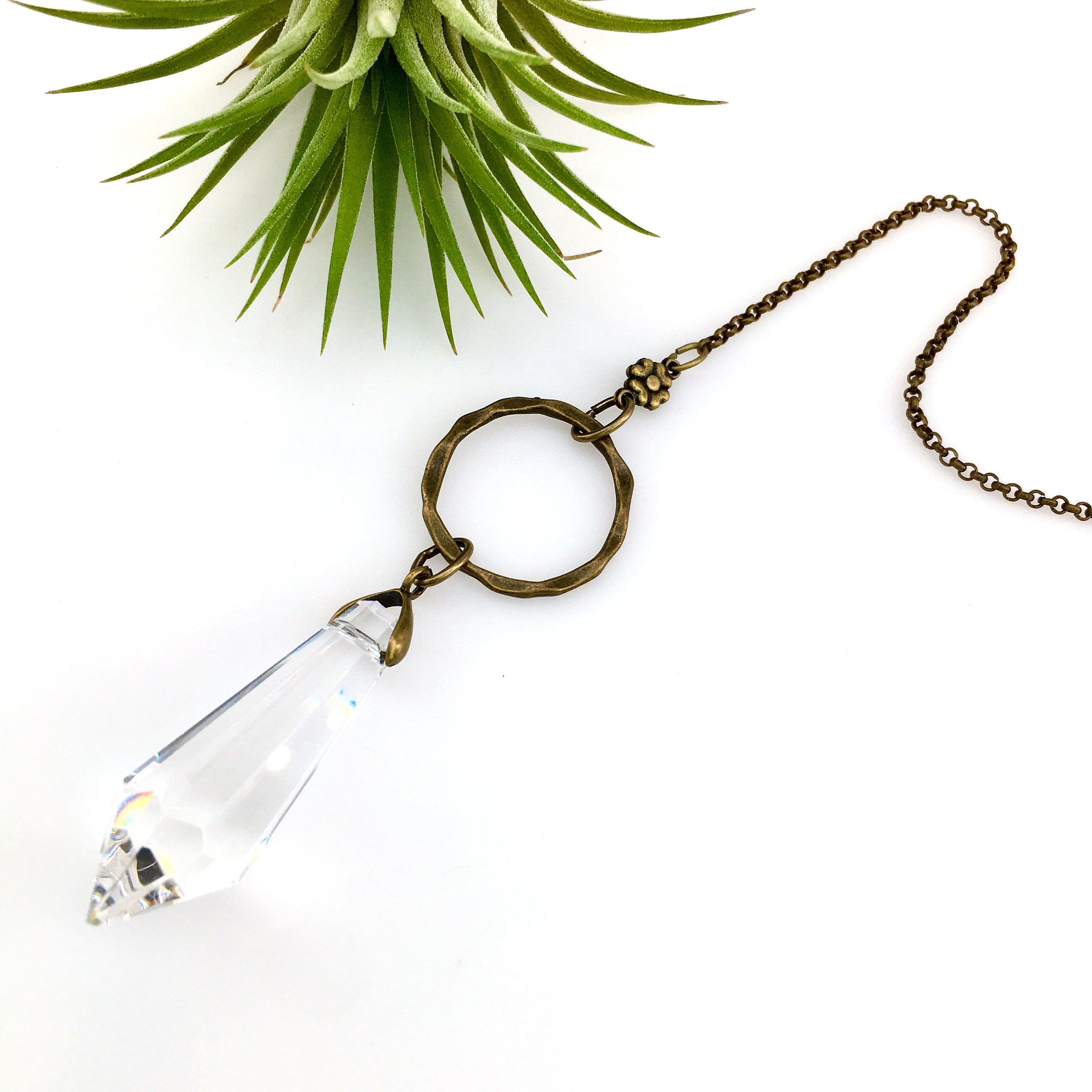 Simplistic in our unique hand made design, made with high-quality Asfour crystal prism (38mm) carefully hand strung with simple hammered bronze focal to give an irresistible appearance.