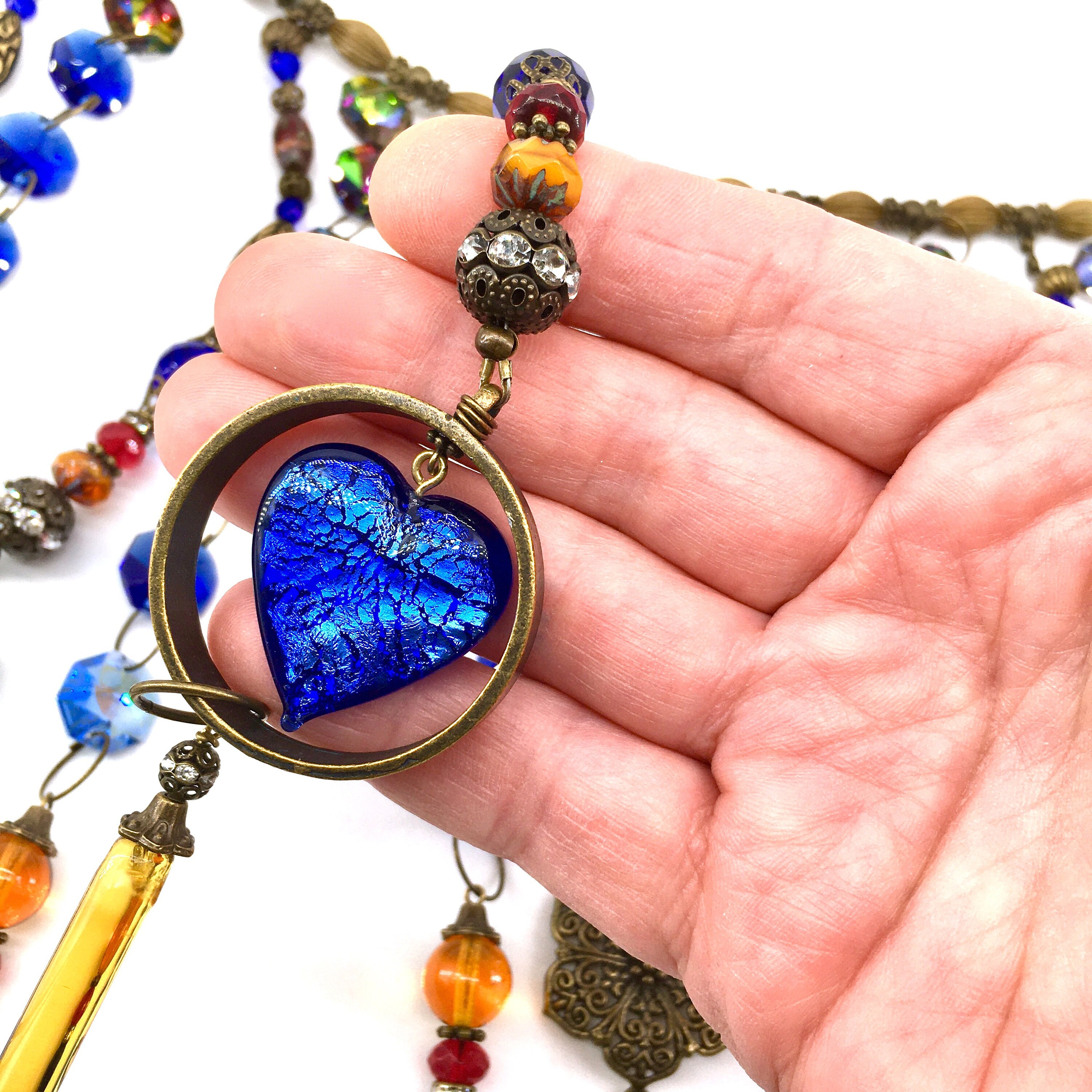 Vintage and new Murano chandelier crystal. Beads and Crystal include: Swarovski, vintage and new Czech glass, and vintage Egyptian glass. Metal tone in Antique Bronze finished. Heart focal is handmade fused glass with Dichroic coating.