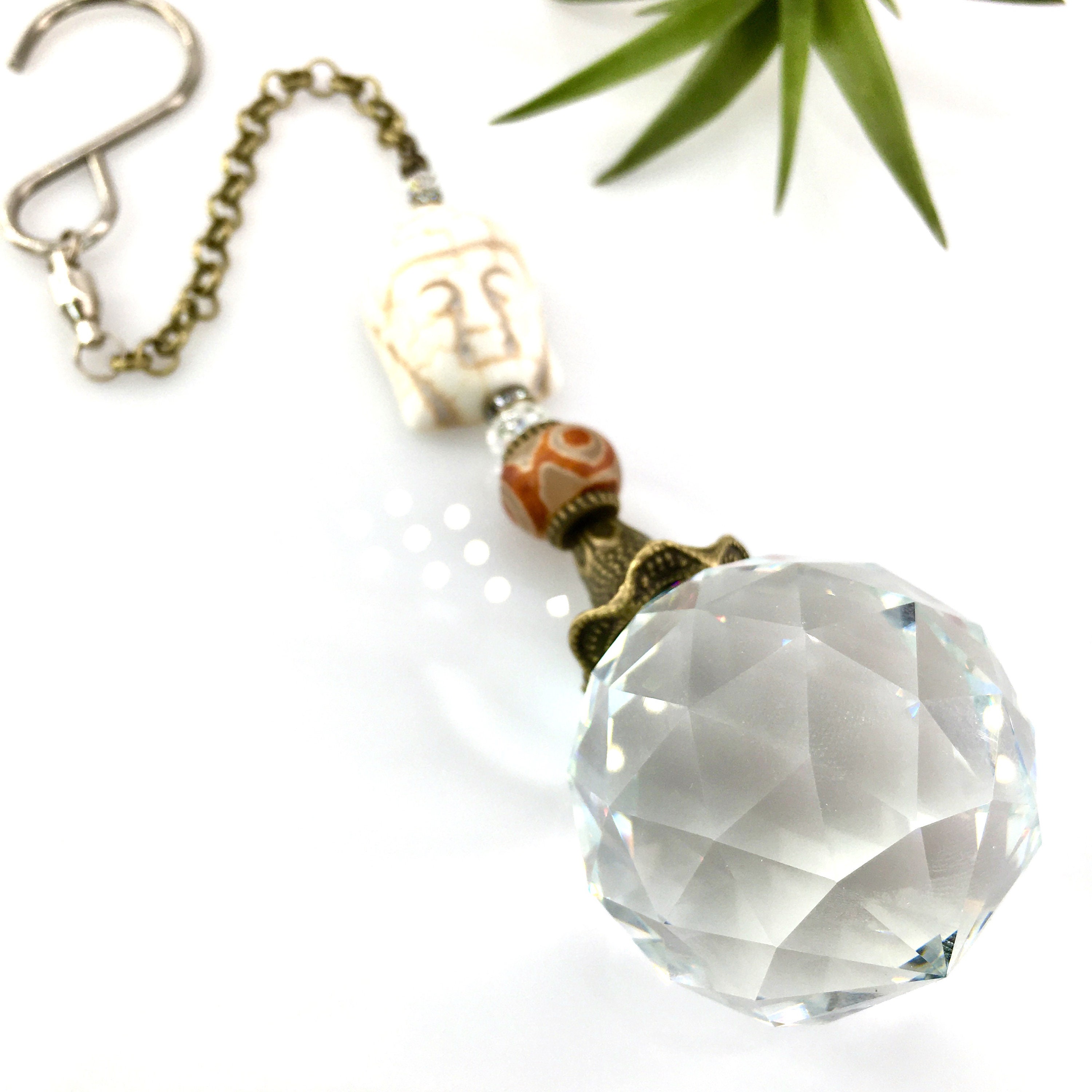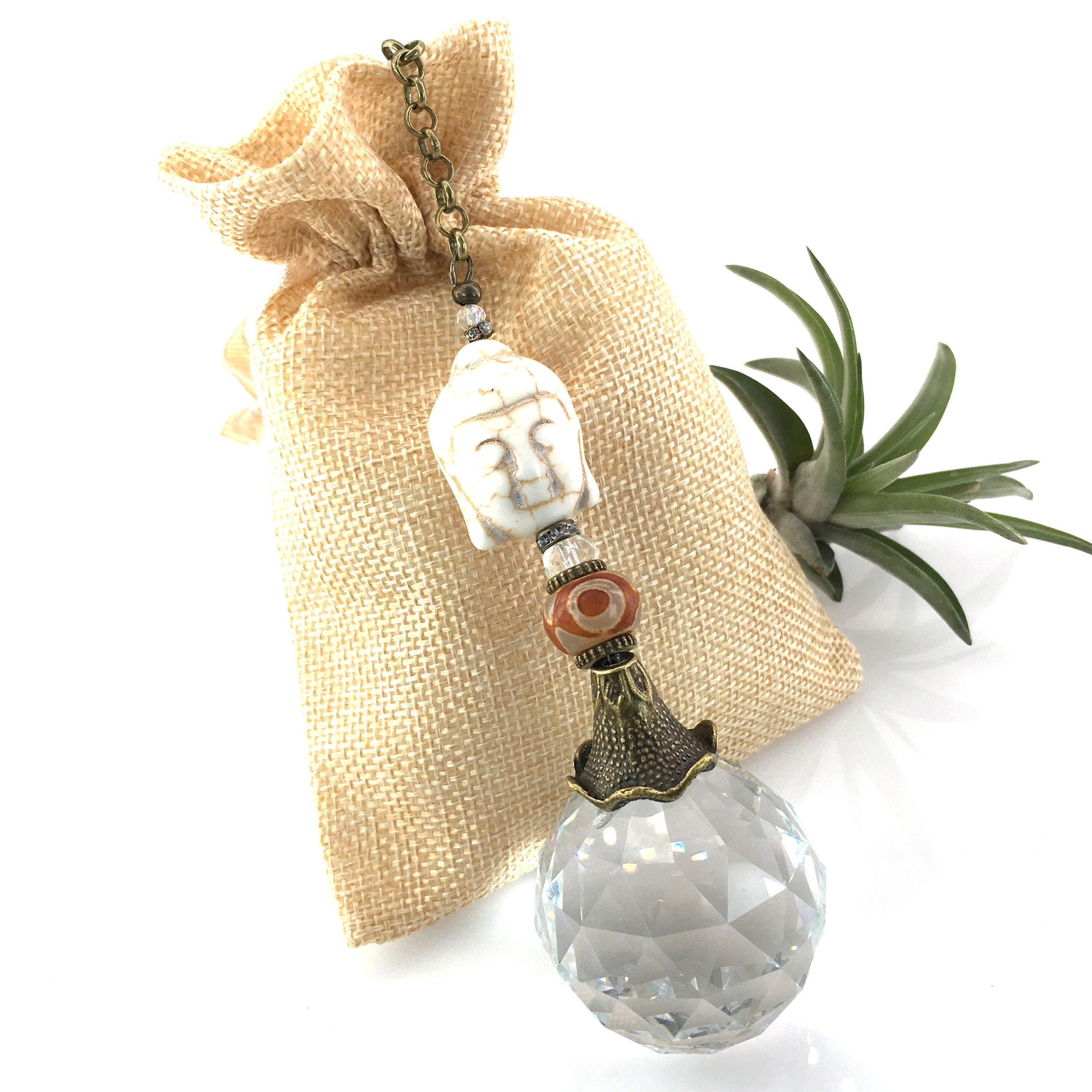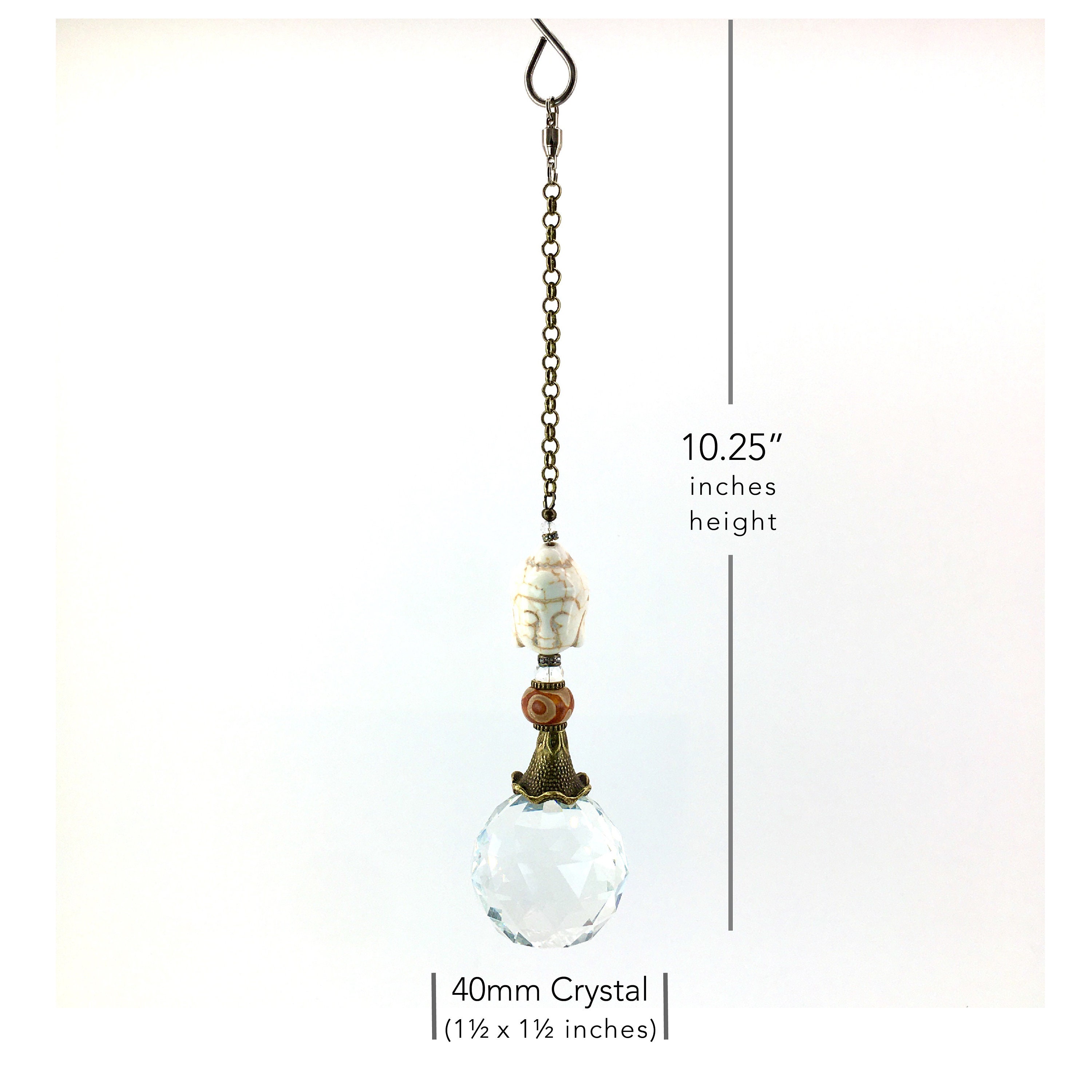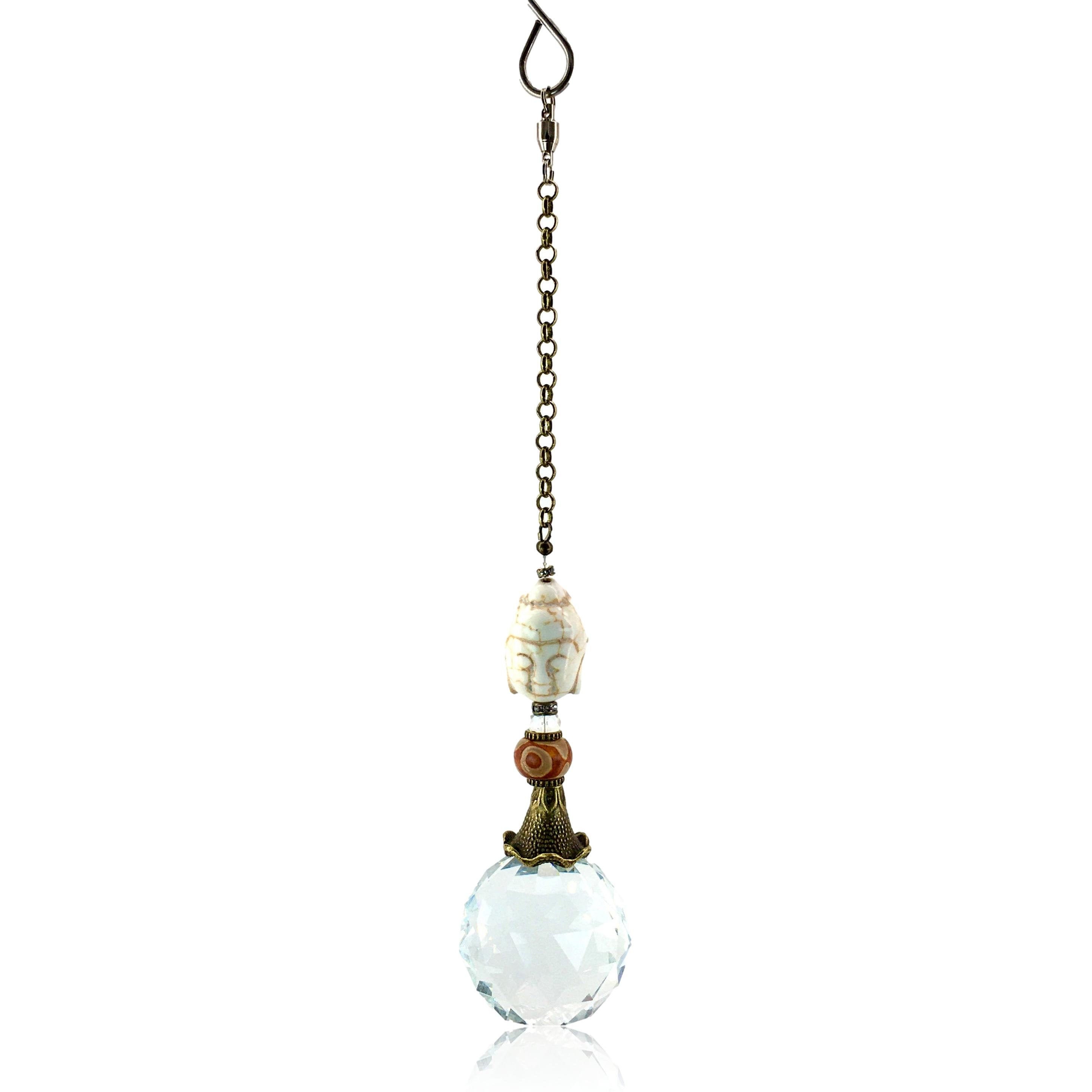 Simplistic in our unique, hand made design, made with high-quality craftsmanship faceted crystal prism sphere (40mm) carefully hand strung with unique howlite gemstone carved Budha focal and unique Czech glass beads to give an irresistible appearance. Finished with a sturdy chain and solid swivel hook for easy hanging.