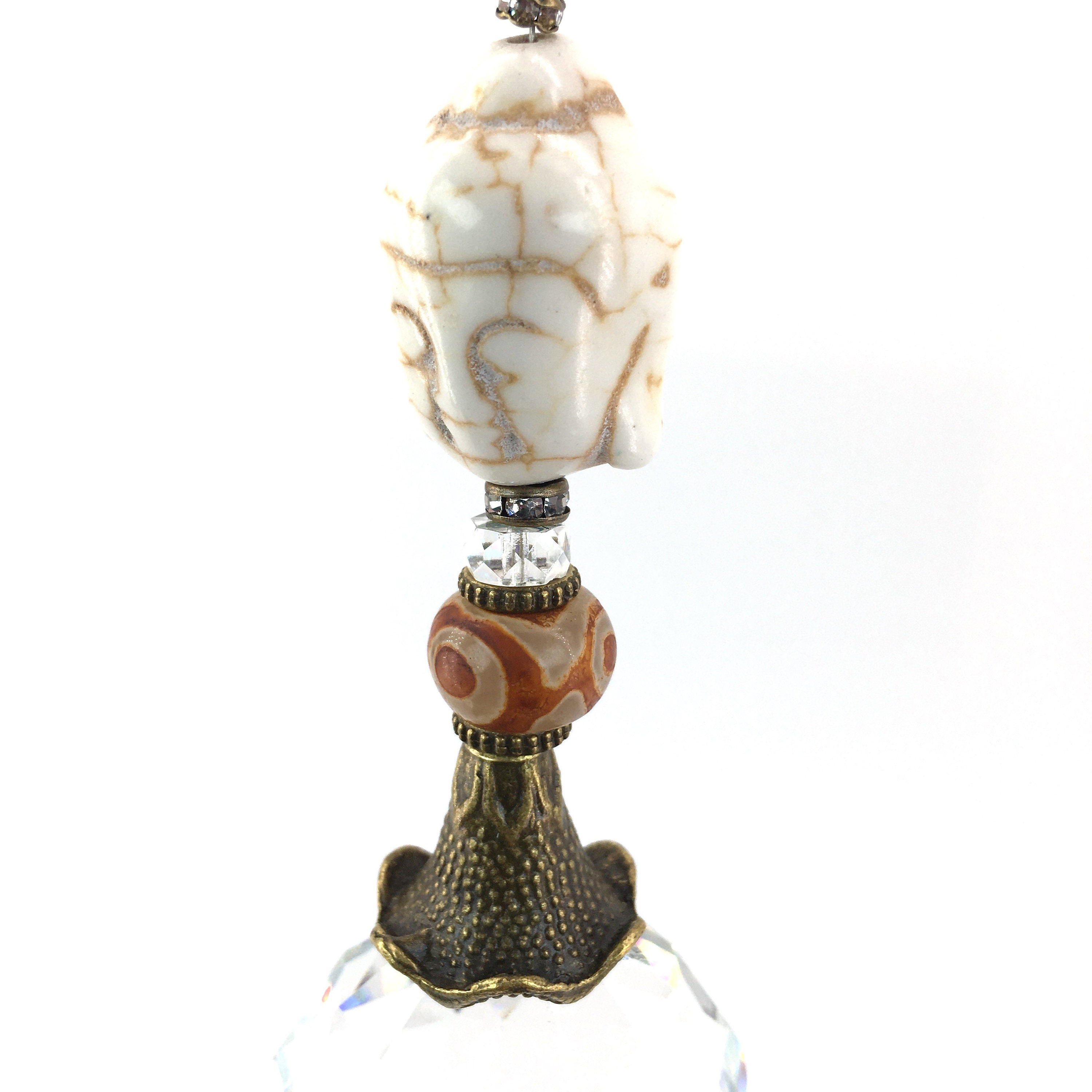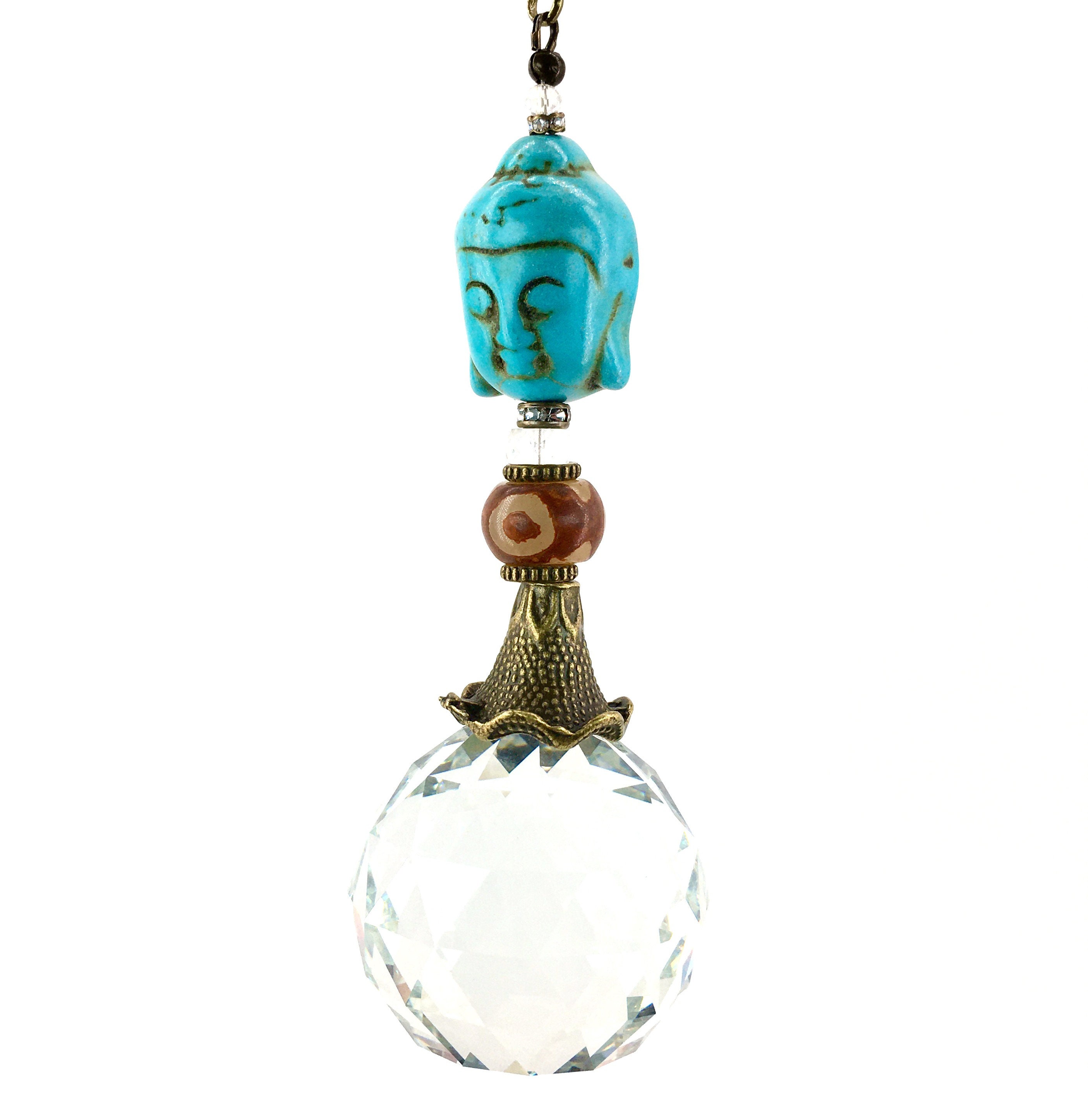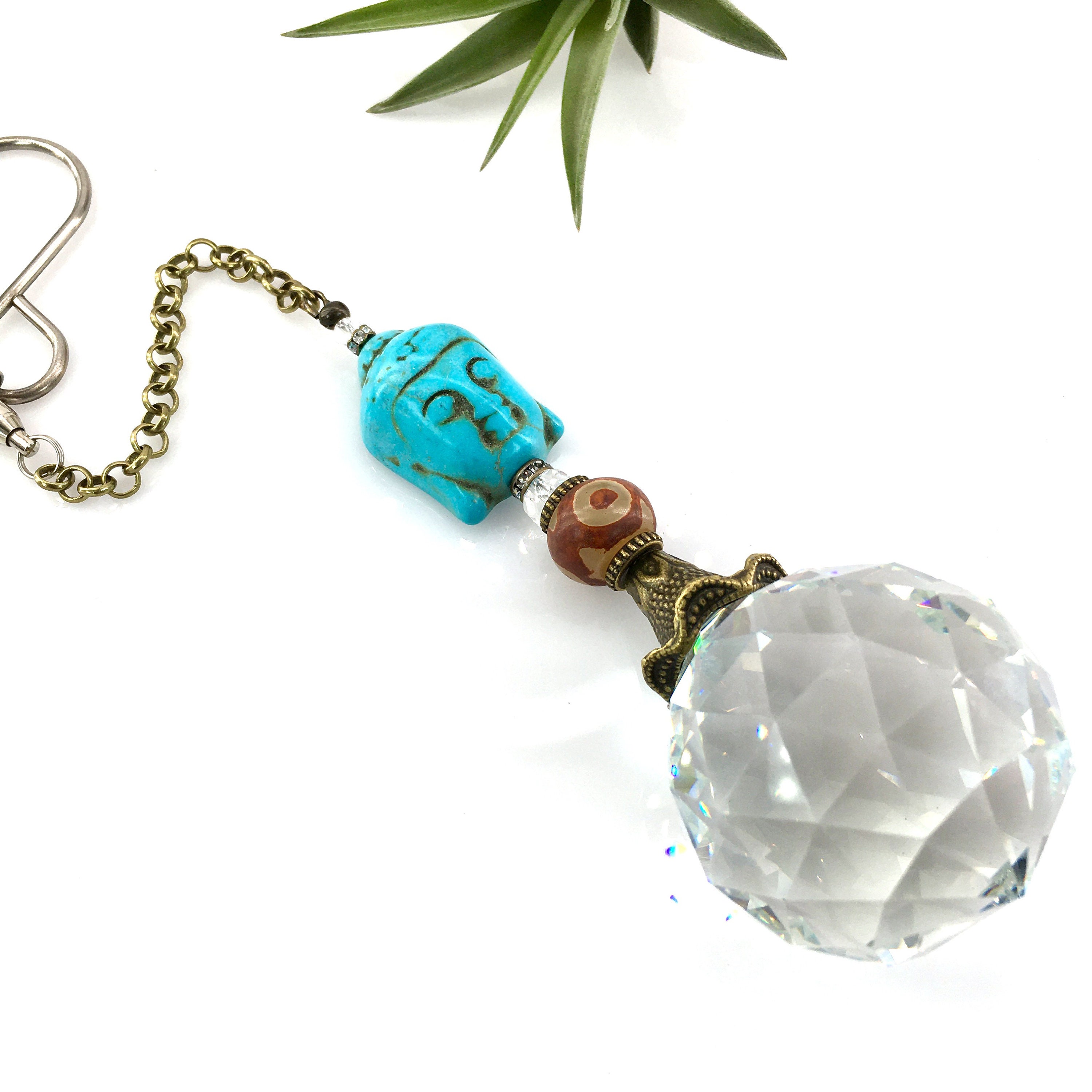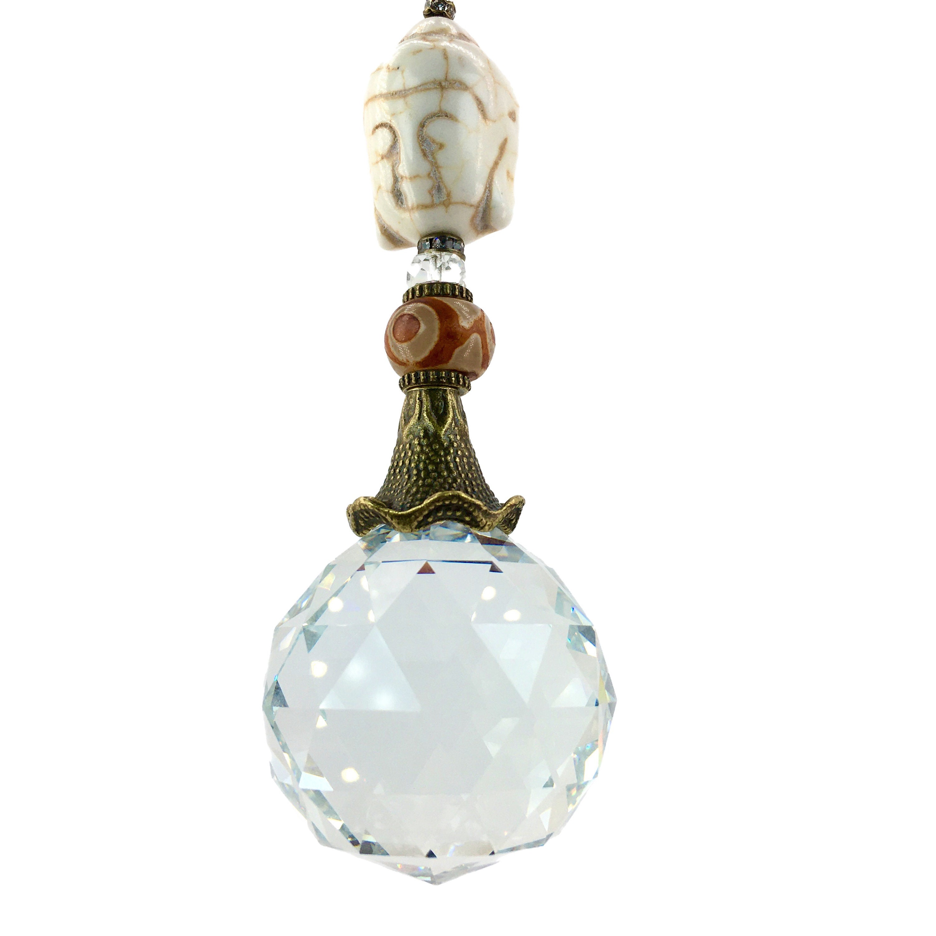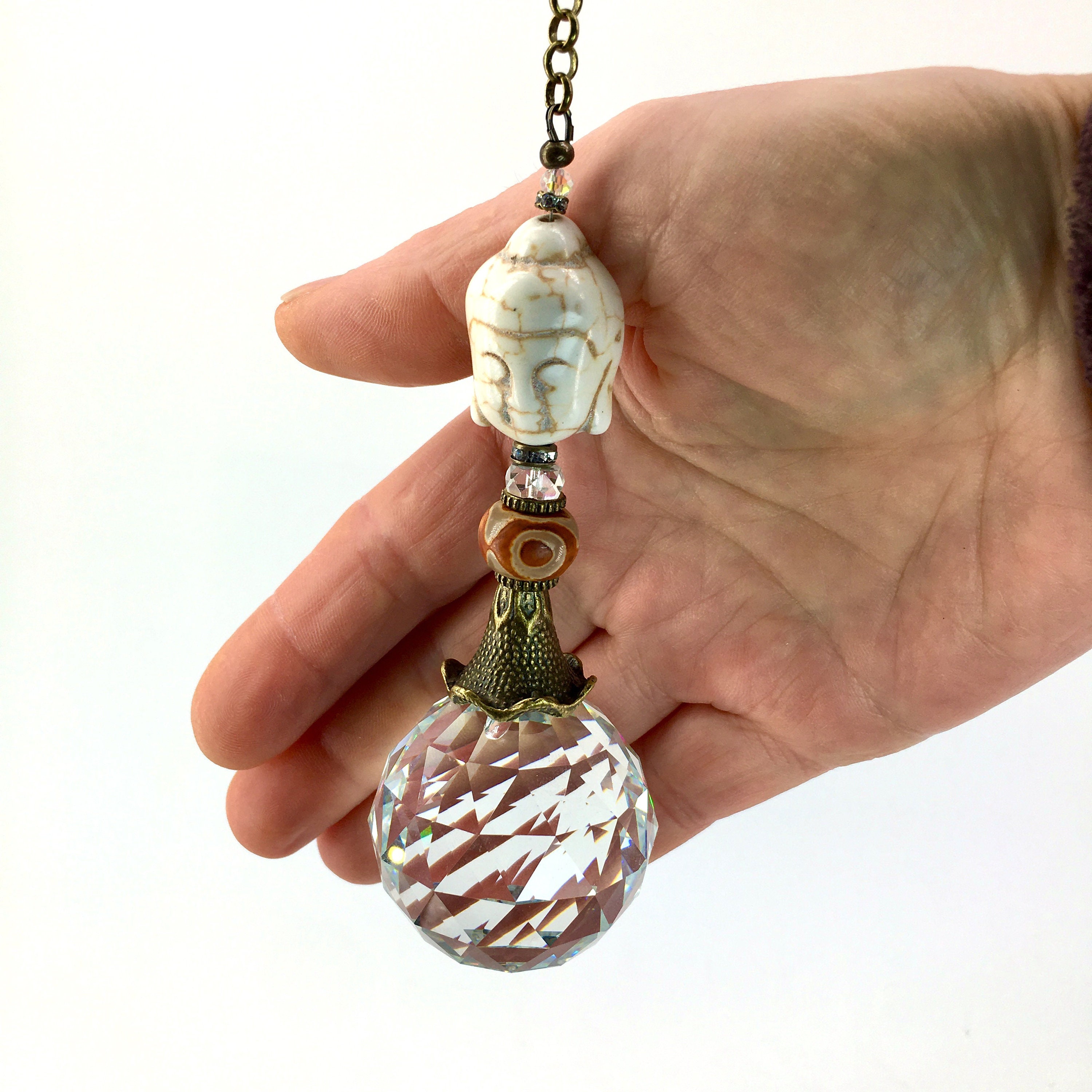 Simplistic in our unique, hand made design, made with high-quality craftsmanship faceted crystal prism sphere (40mm) carefully hand strung with unique howlite gemstone carved Budha focal and unique Czech glass beads to give an irresistible appearance. Finished with a sturdy chain and solid swivel hook for easy hanging.