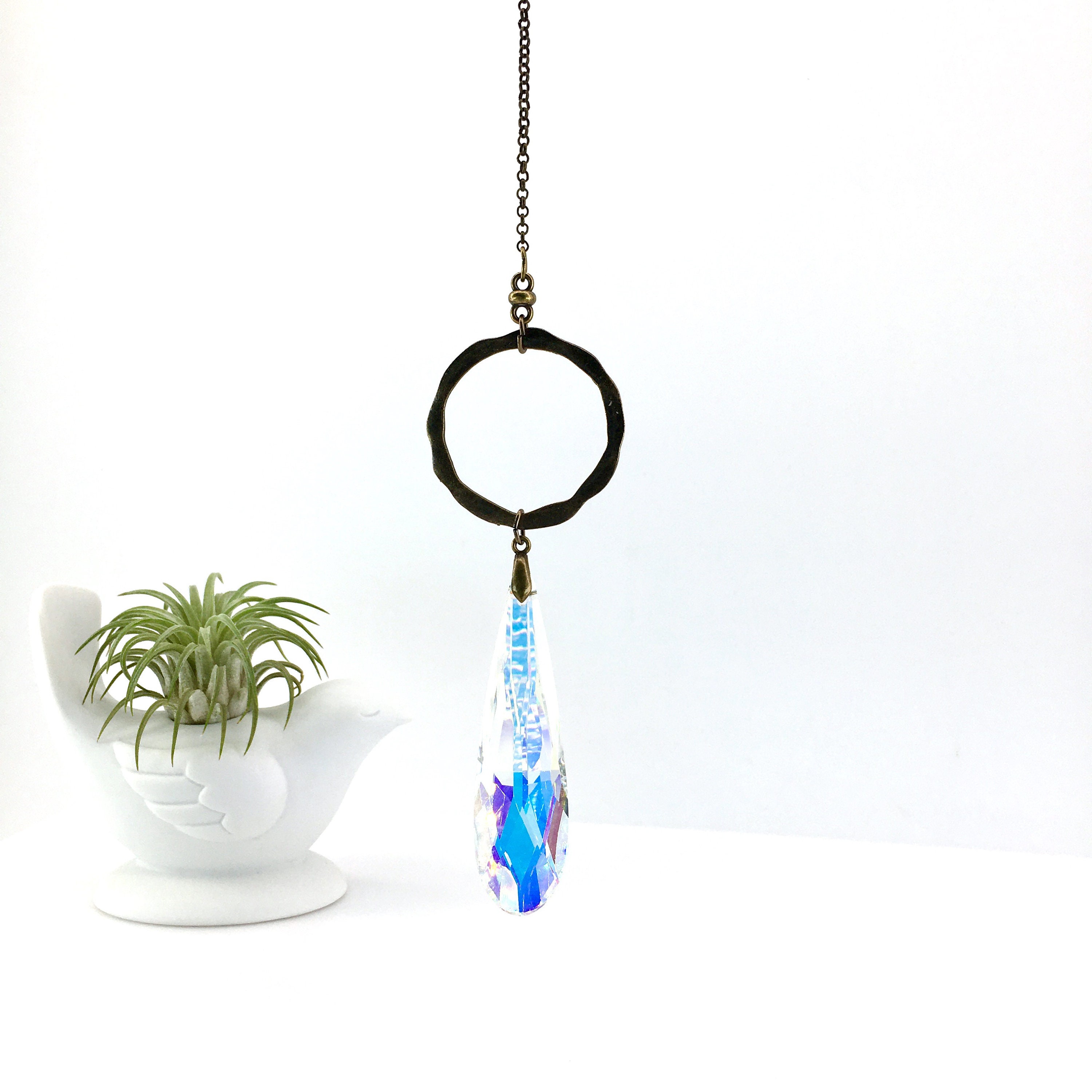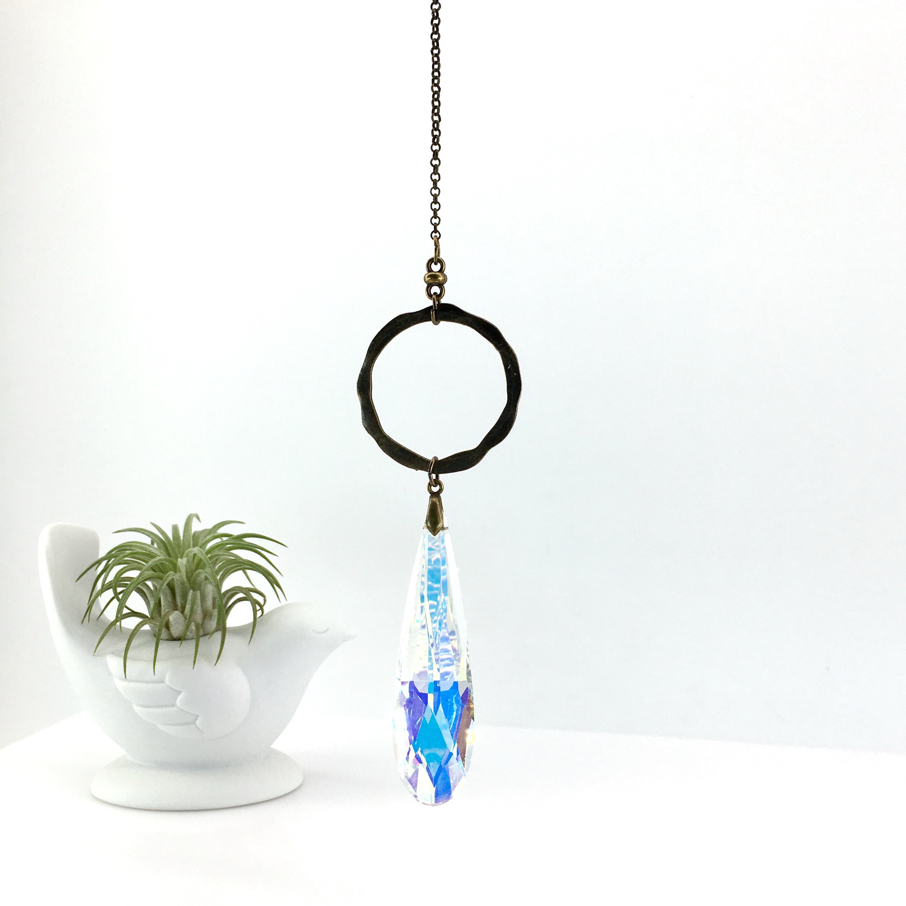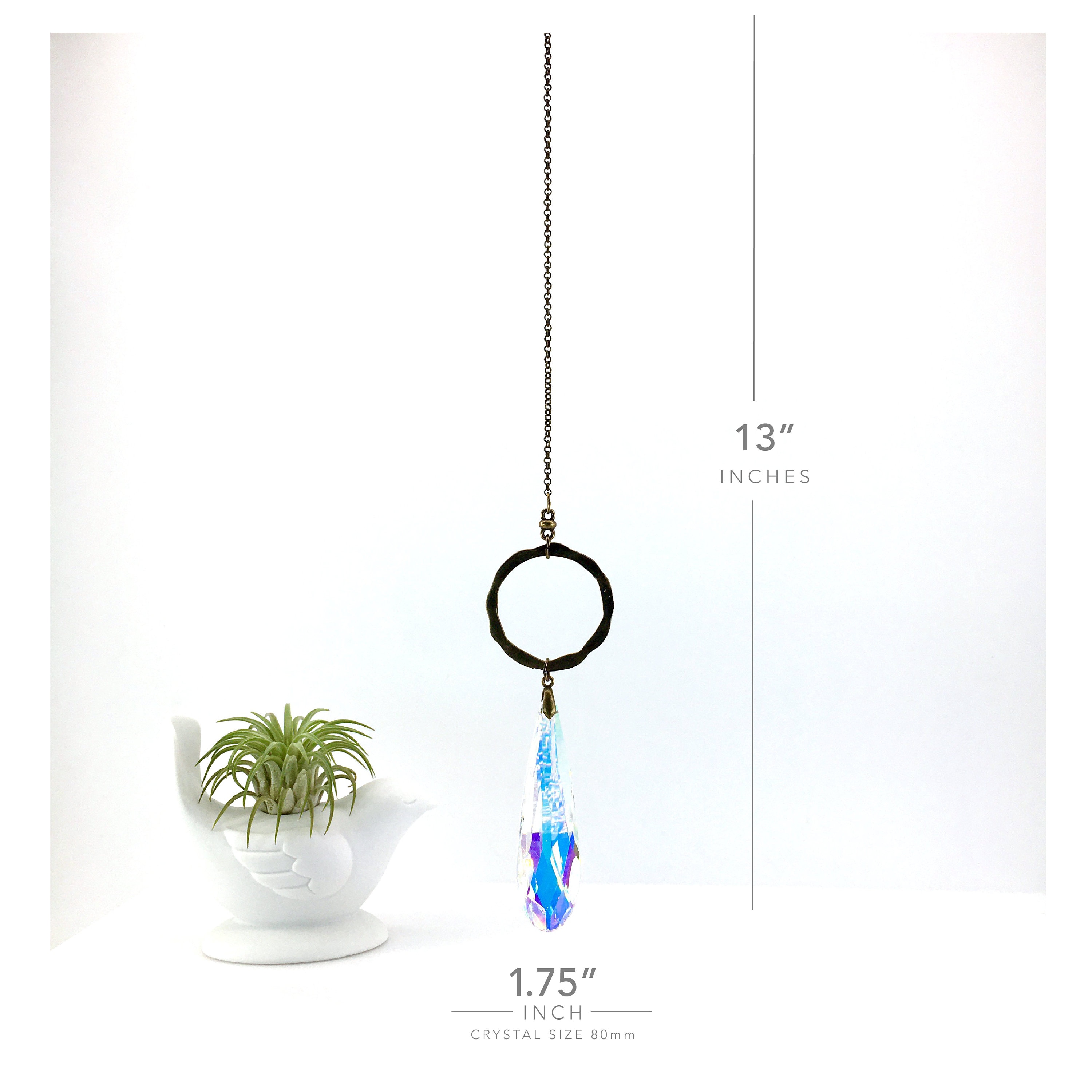 Our handcrafted sun catcher is a simplistic yet unique design, featuring a high-quality 80mm (3-inch) faceted AB crystal prism. This eye-catching crystal is meticulously hand-strung with a distinctive textured bronze focal ring.