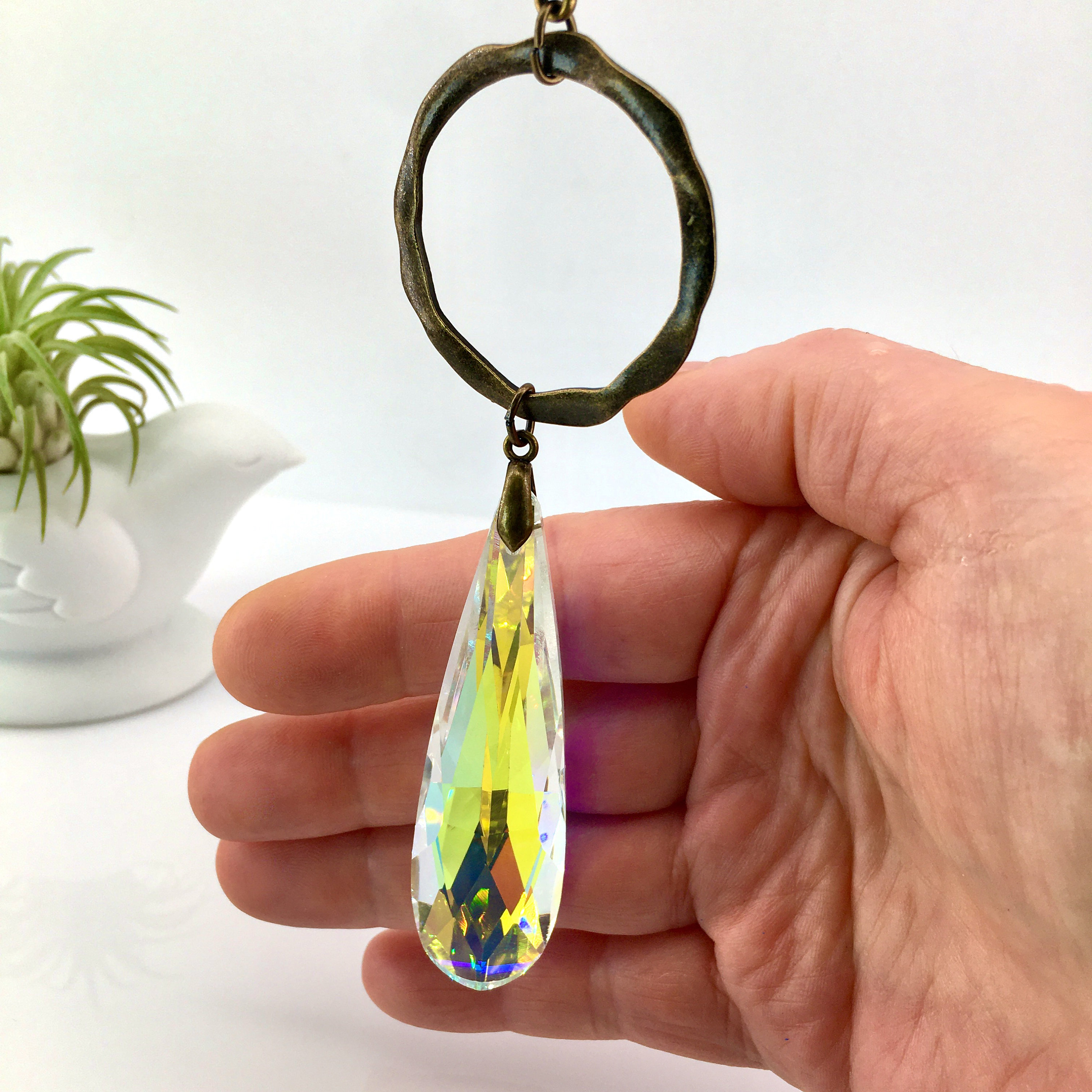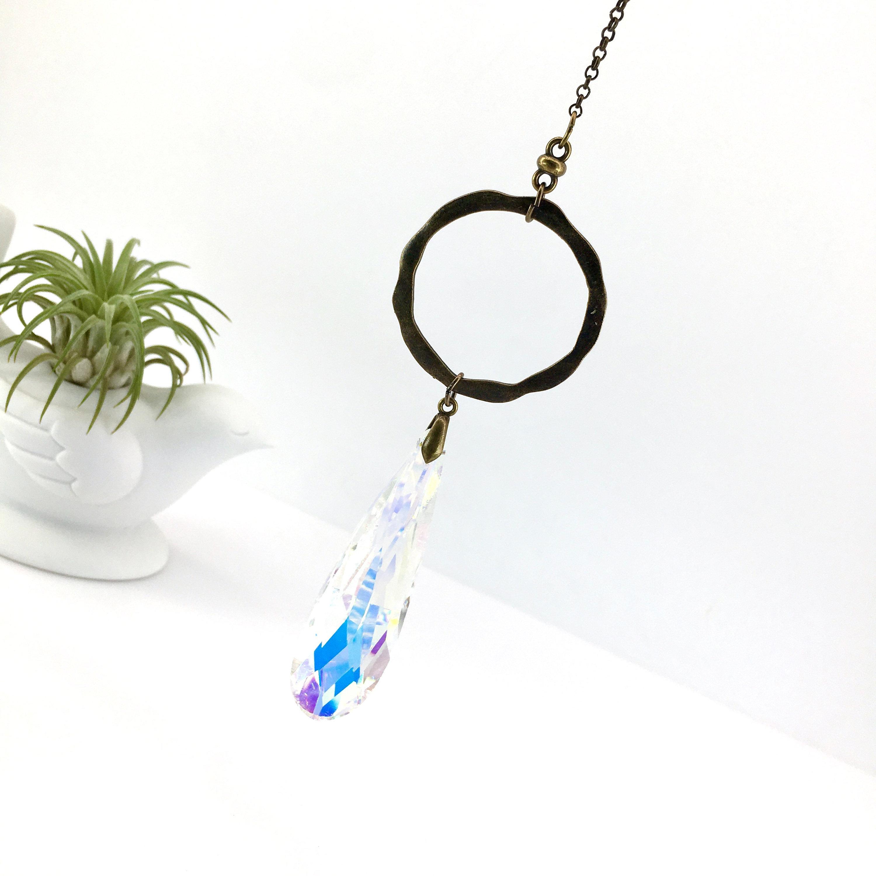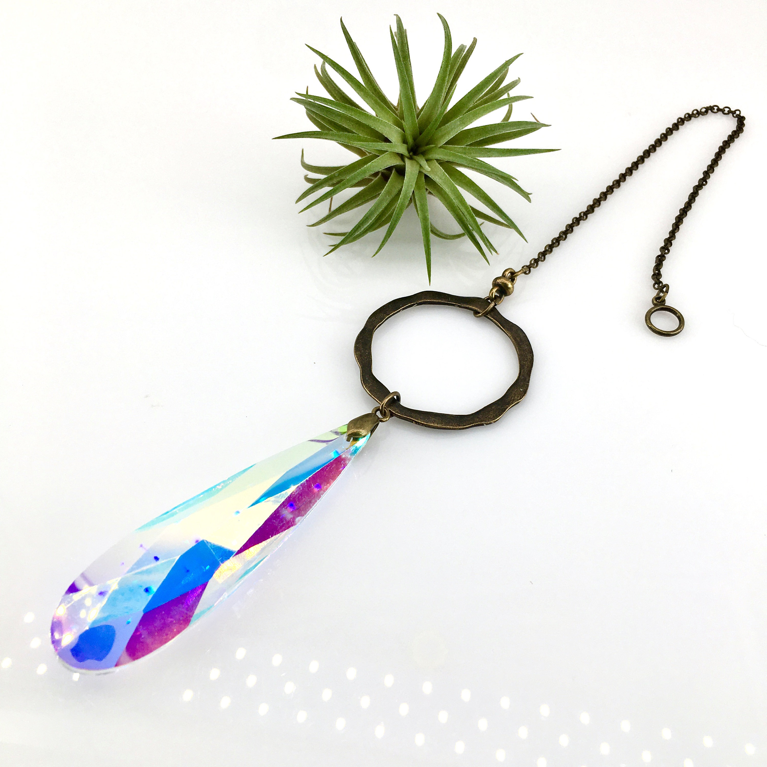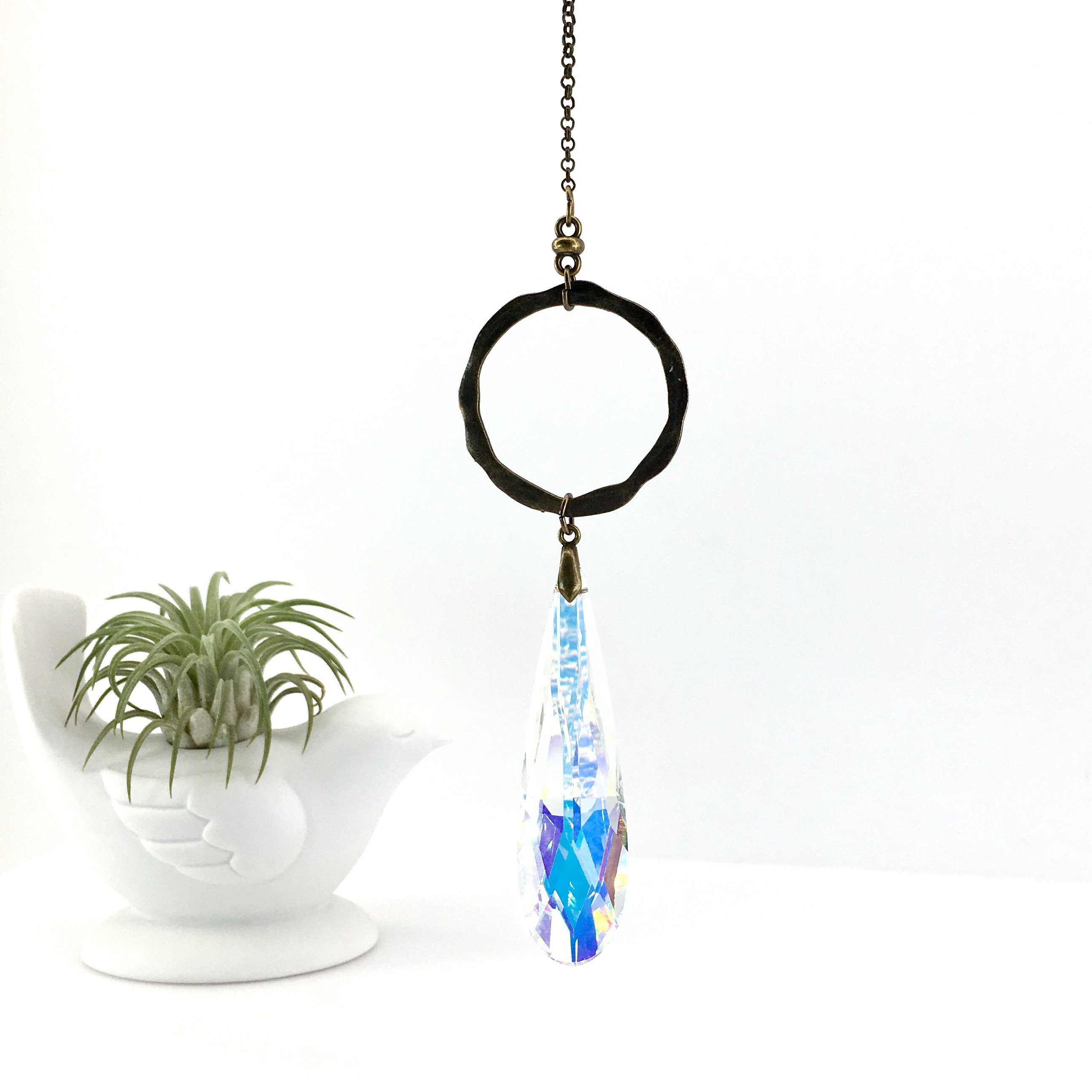 Our handcrafted sun catcher is a simplistic yet unique design, featuring a high-quality 80mm (3-inch) faceted AB crystal prism. This eye-catching crystal is meticulously hand-strung with a distinctive textured bronze focal ring.
