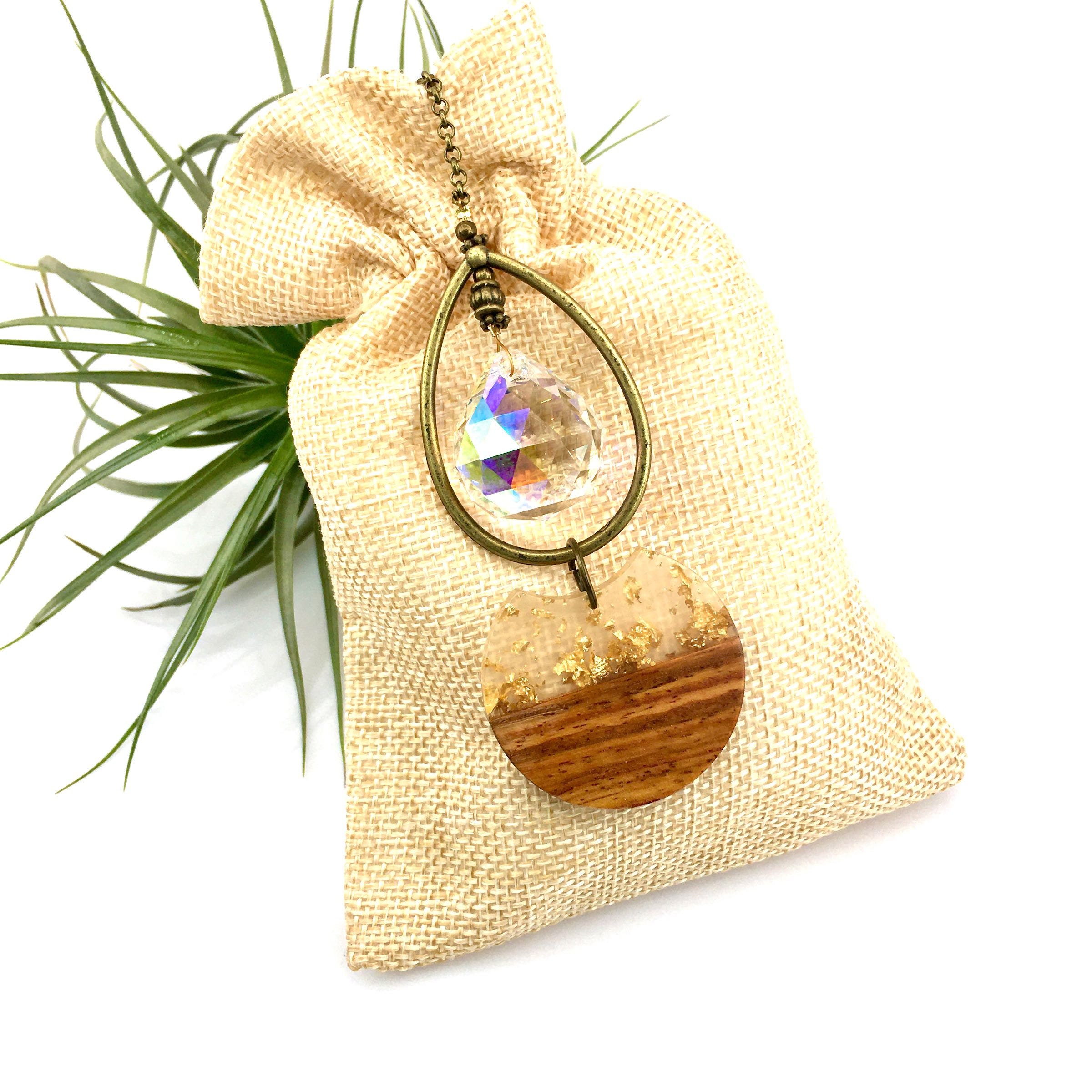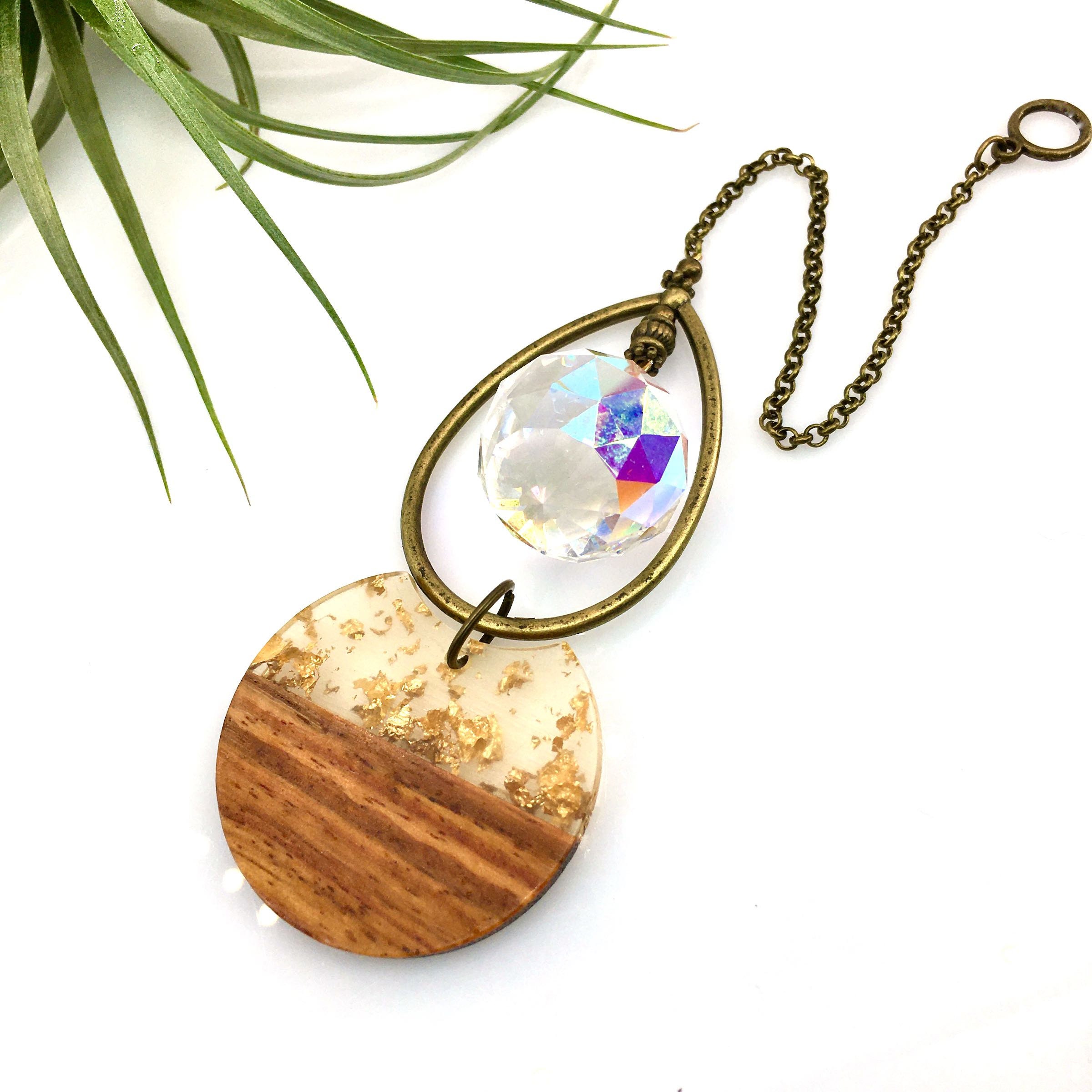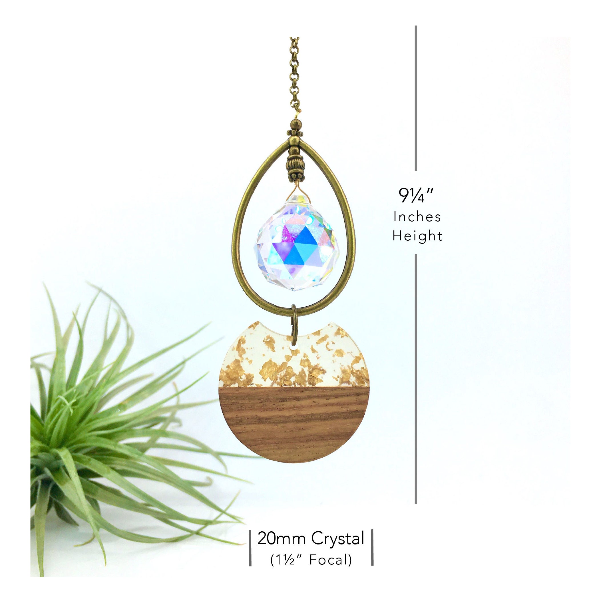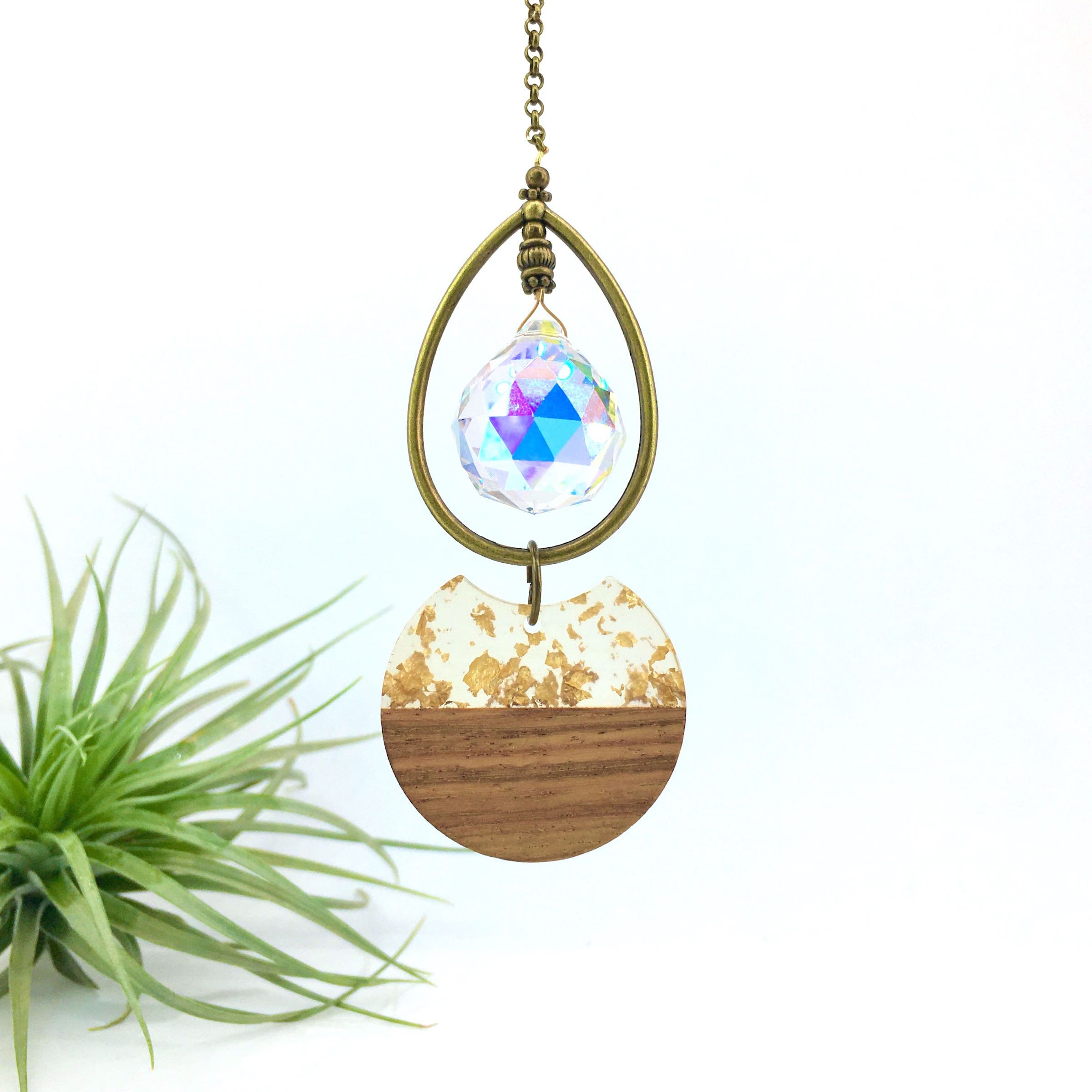 Simplistic in our unique and hand made design, with high-quality craftsmanship, faceted Asfour crystal prism sphere (20mm AB). Carefully hand strung with various beads, including beautiful wood and resin focal featuring gold leaf flakes in a unique shape to give an irresistible appearance. Finished with a sturdy chain and hook for easy hanging. Perfect size for rearview mirror, car charm hanging.