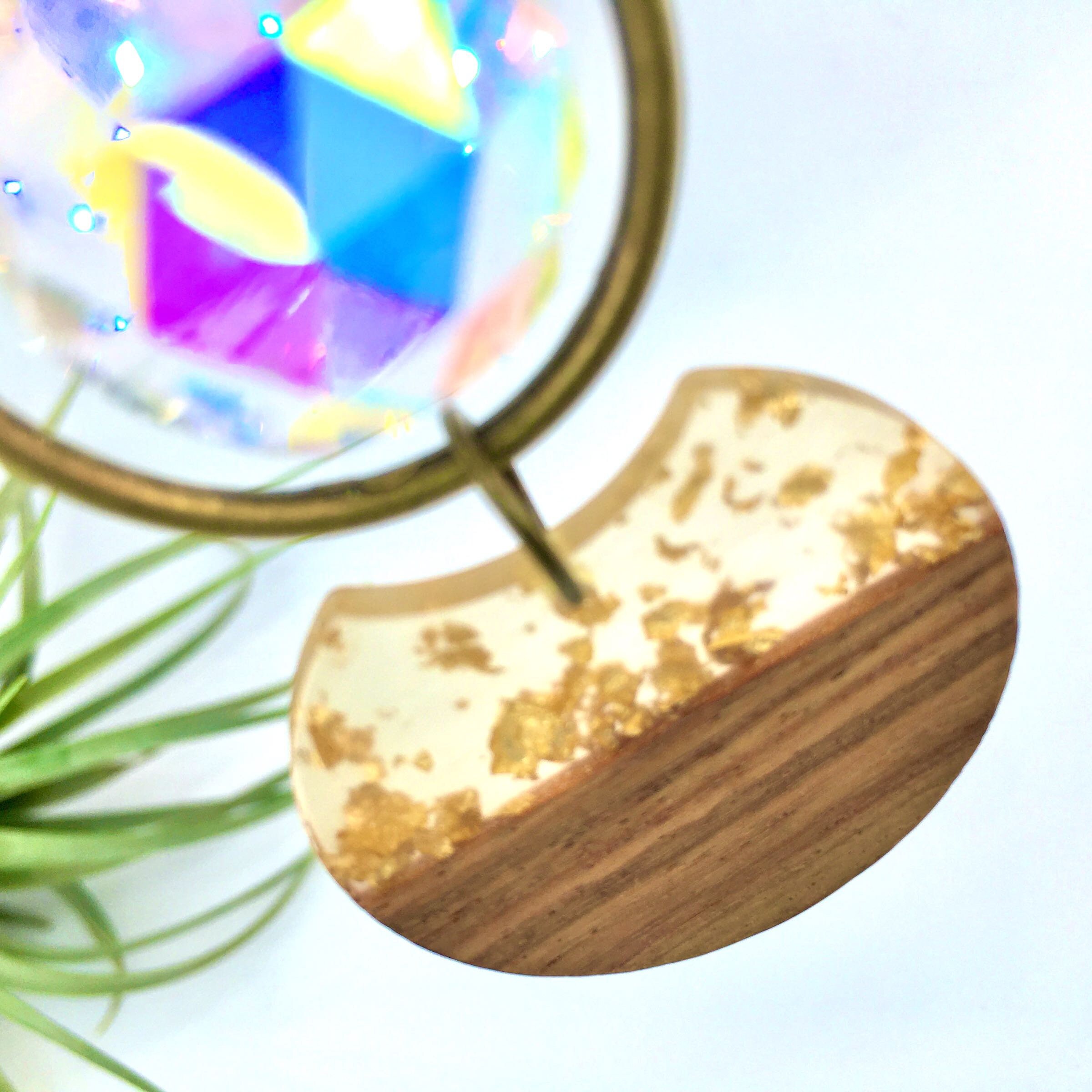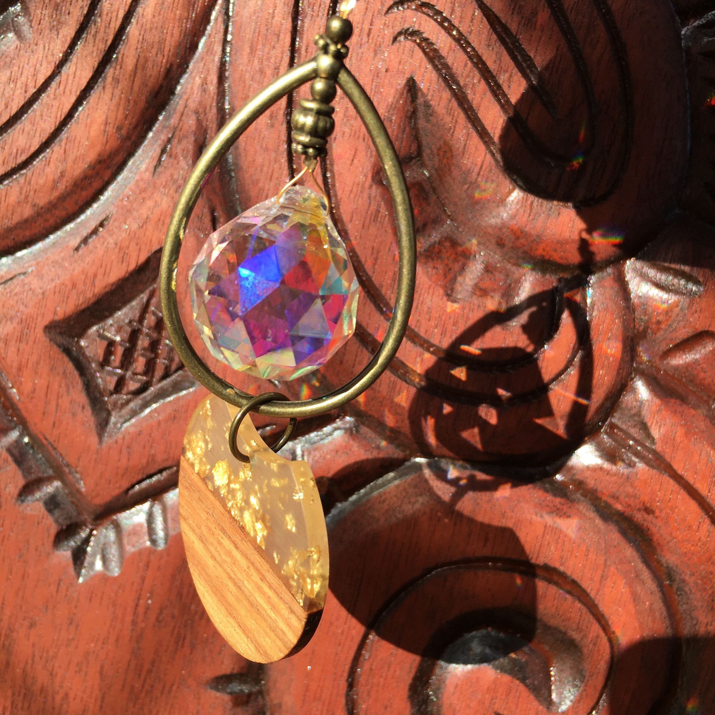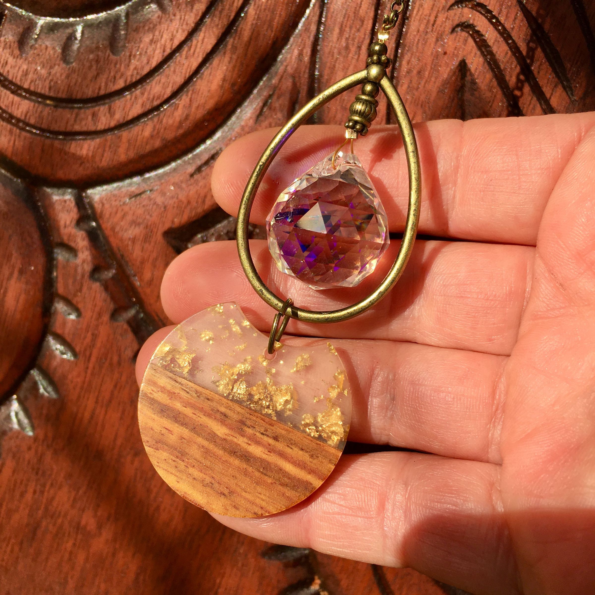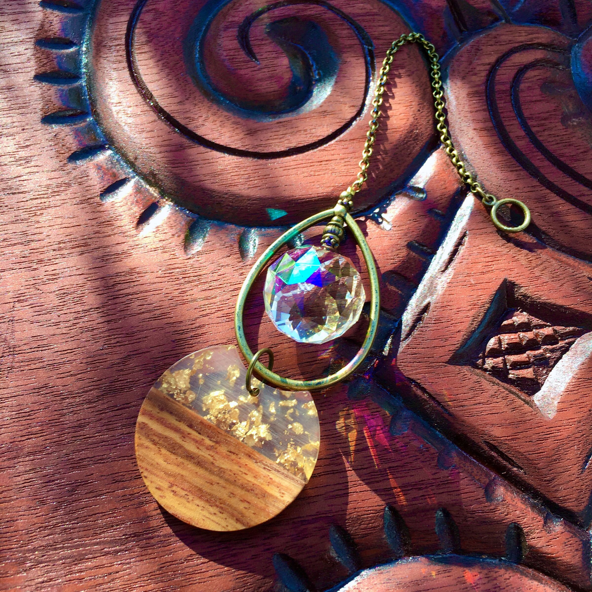 Simplistic in our unique and hand made design, with high-quality craftsmanship, faceted Asfour crystal prism sphere (20mm AB). Carefully hand strung with various beads, including beautiful wood and resin focal featuring gold leaf flakes in a unique shape to give an irresistible appearance. Finished with a sturdy chain and hook for easy hanging. Perfect size for rearview mirror, car charm hanging.