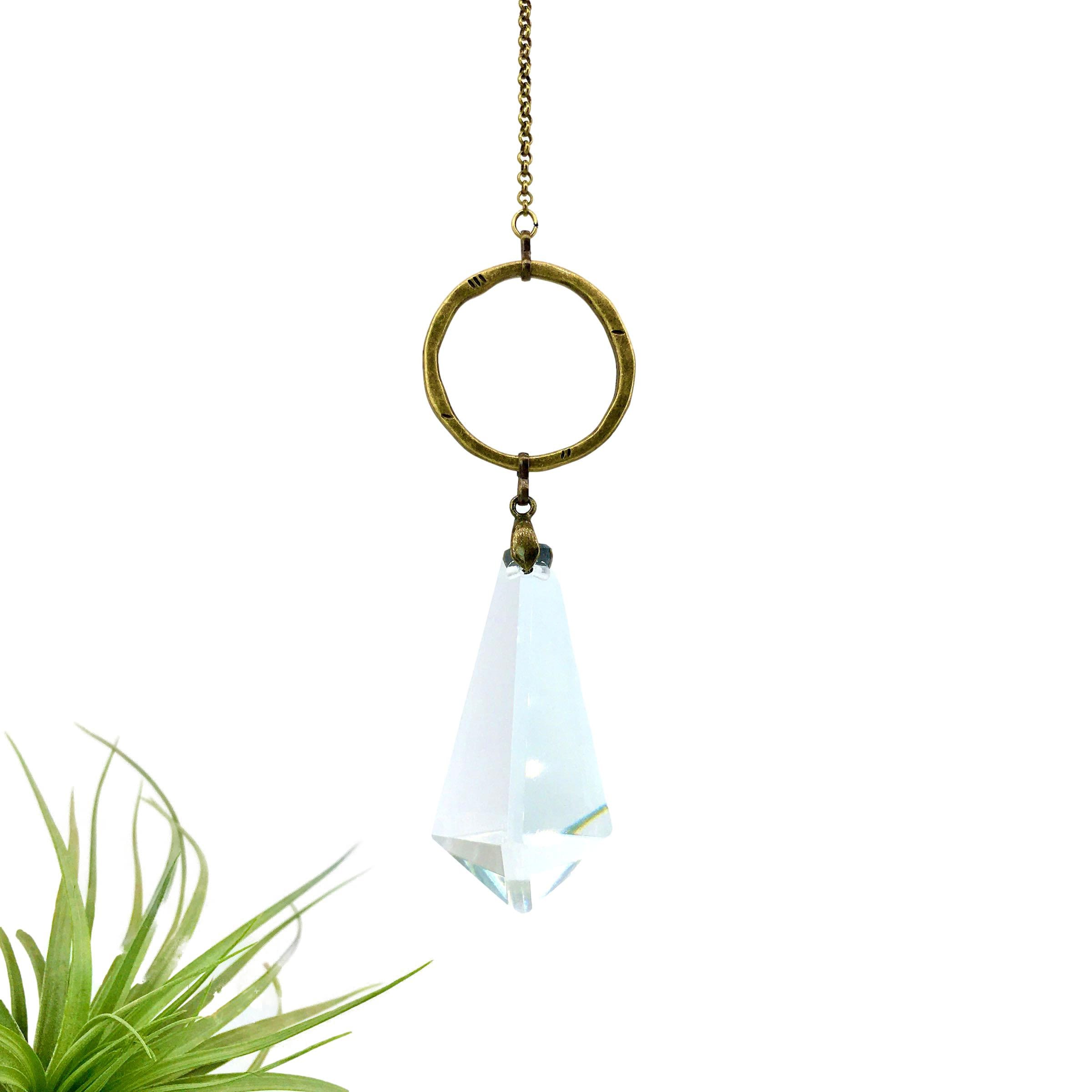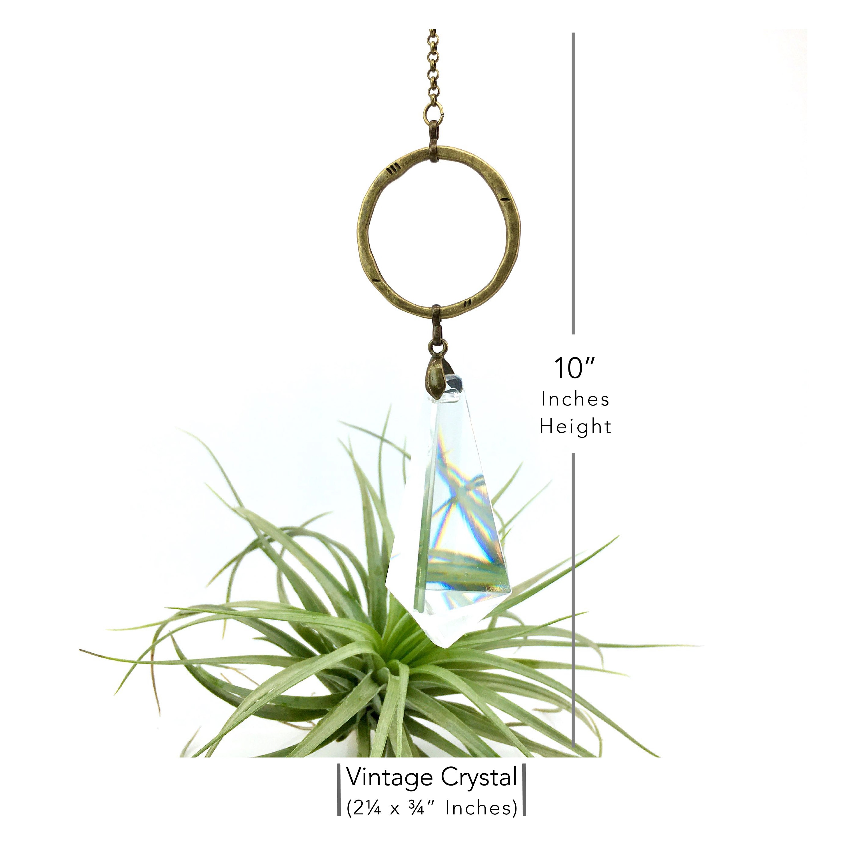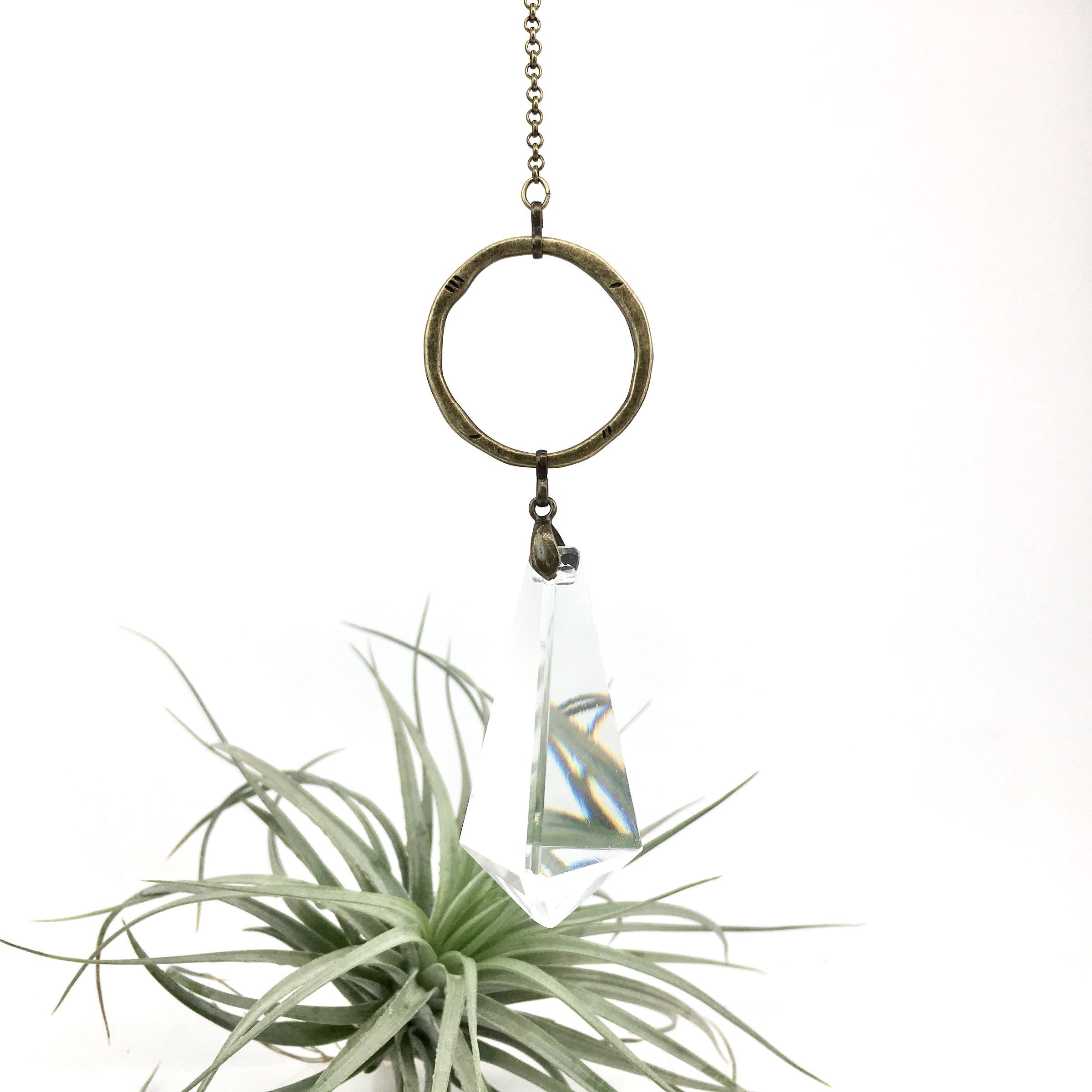 Our sun catcher is a testament to simplicity and elegance, showcasing a beautifully crafted vintage chandelier crystal prism measuring 2.25" x 0.75". Each prism is delicately hand-strung with an array of bronze links in varying shapes, creating a refined and polished aesthetic. The design is completed with a durable chain and hook, ensuring secure and effortless hanging.