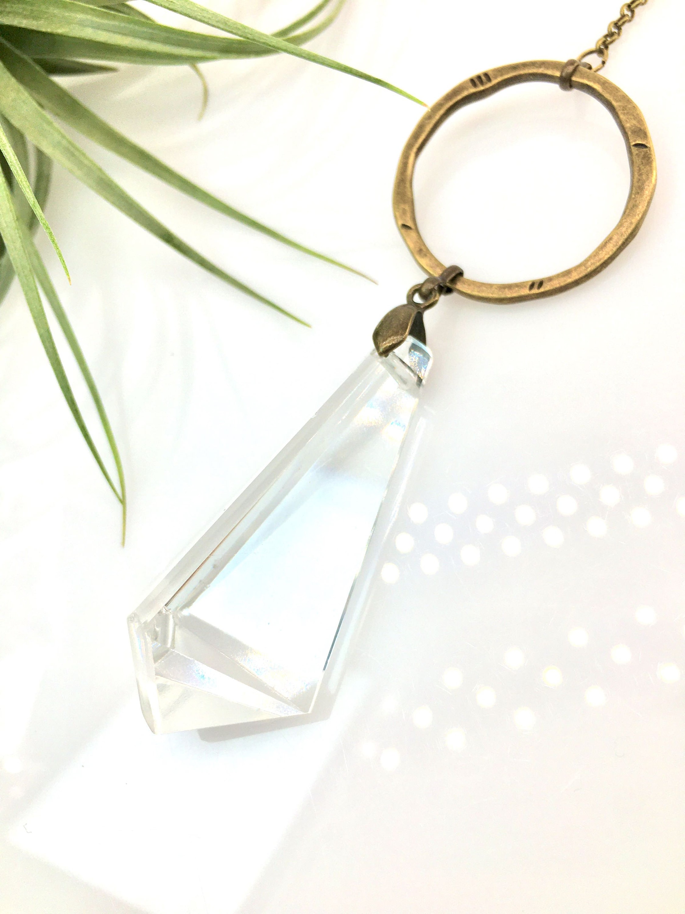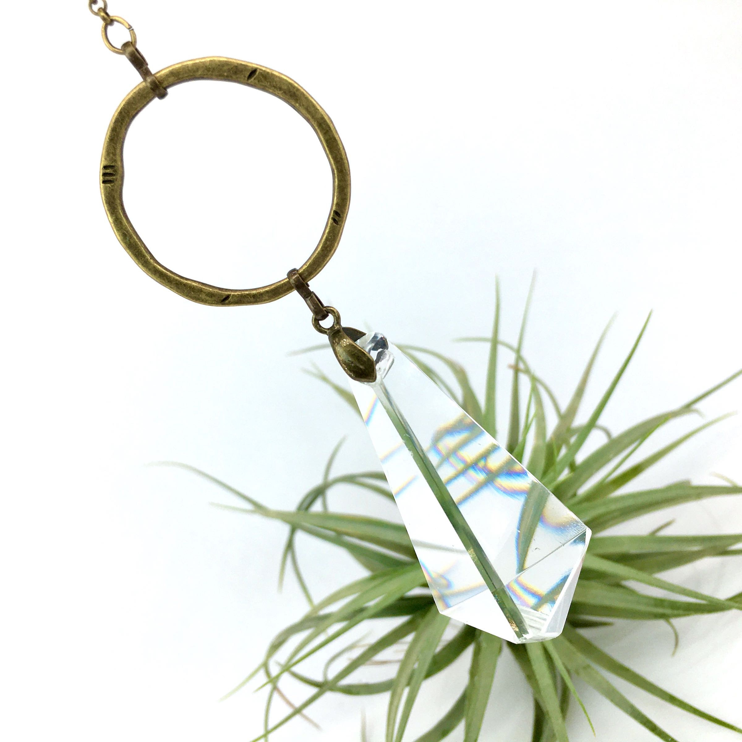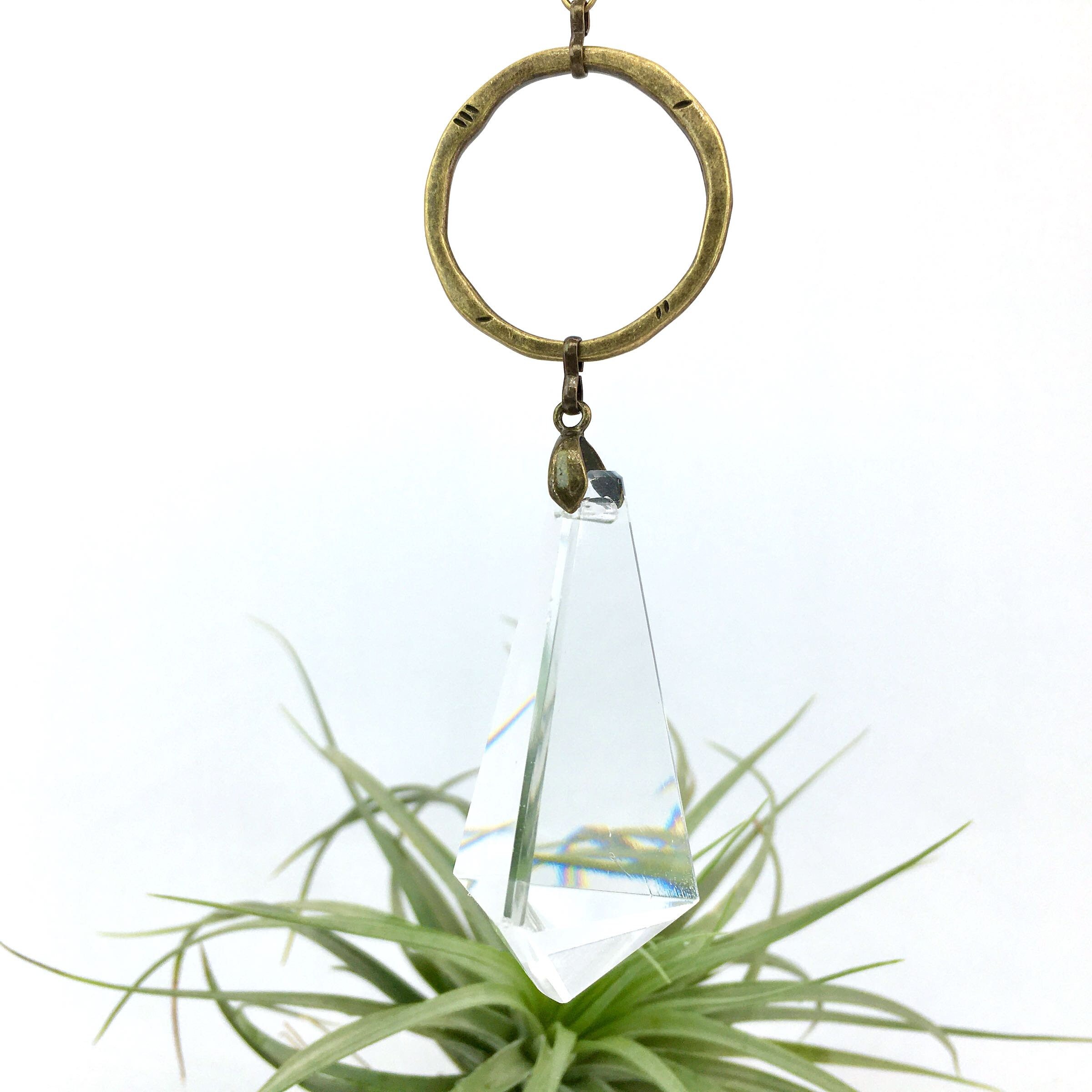 Adorn your living space with the charm of our handcrafted sun catcher, boasting a rare vintage French crystal chandelier prism renowned for its exceptional clarity. This elegant piece is designed with a lovely shape and features simple, textured bronze links that add a touch of sophistication.