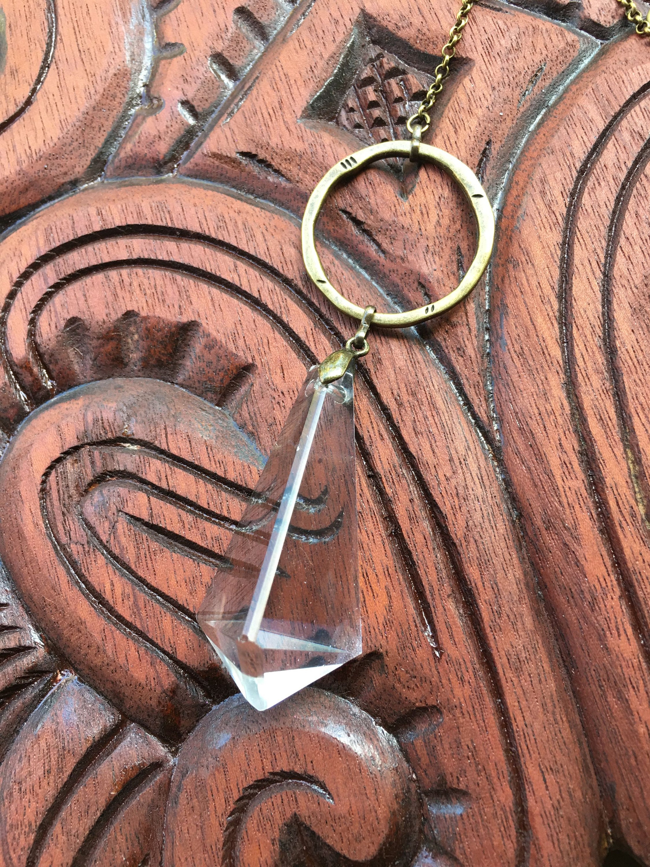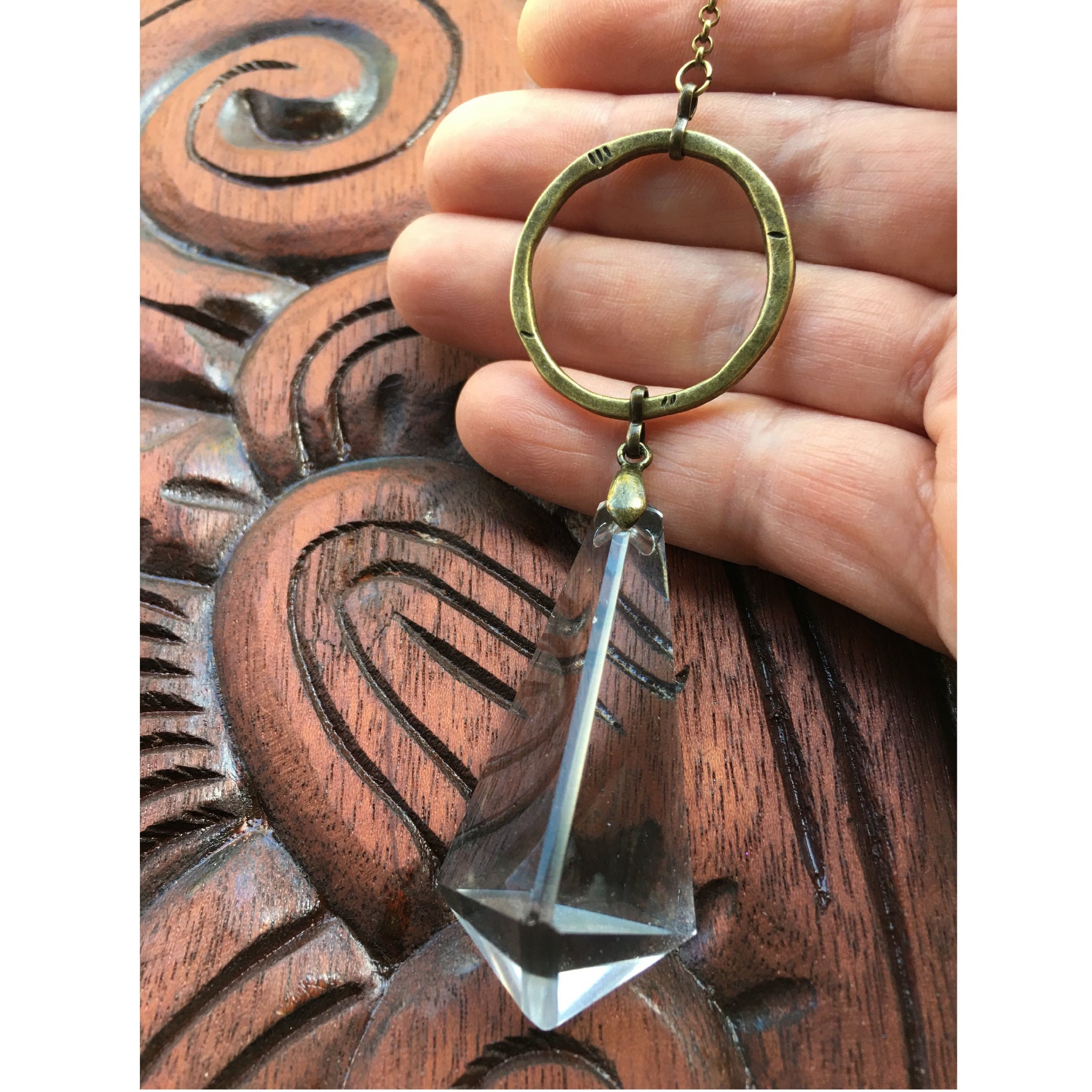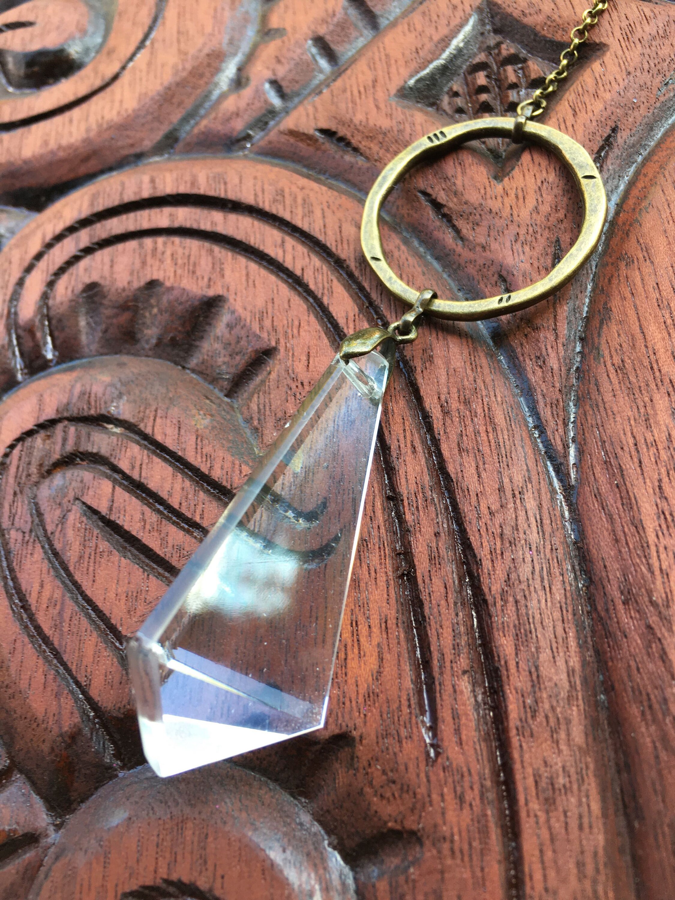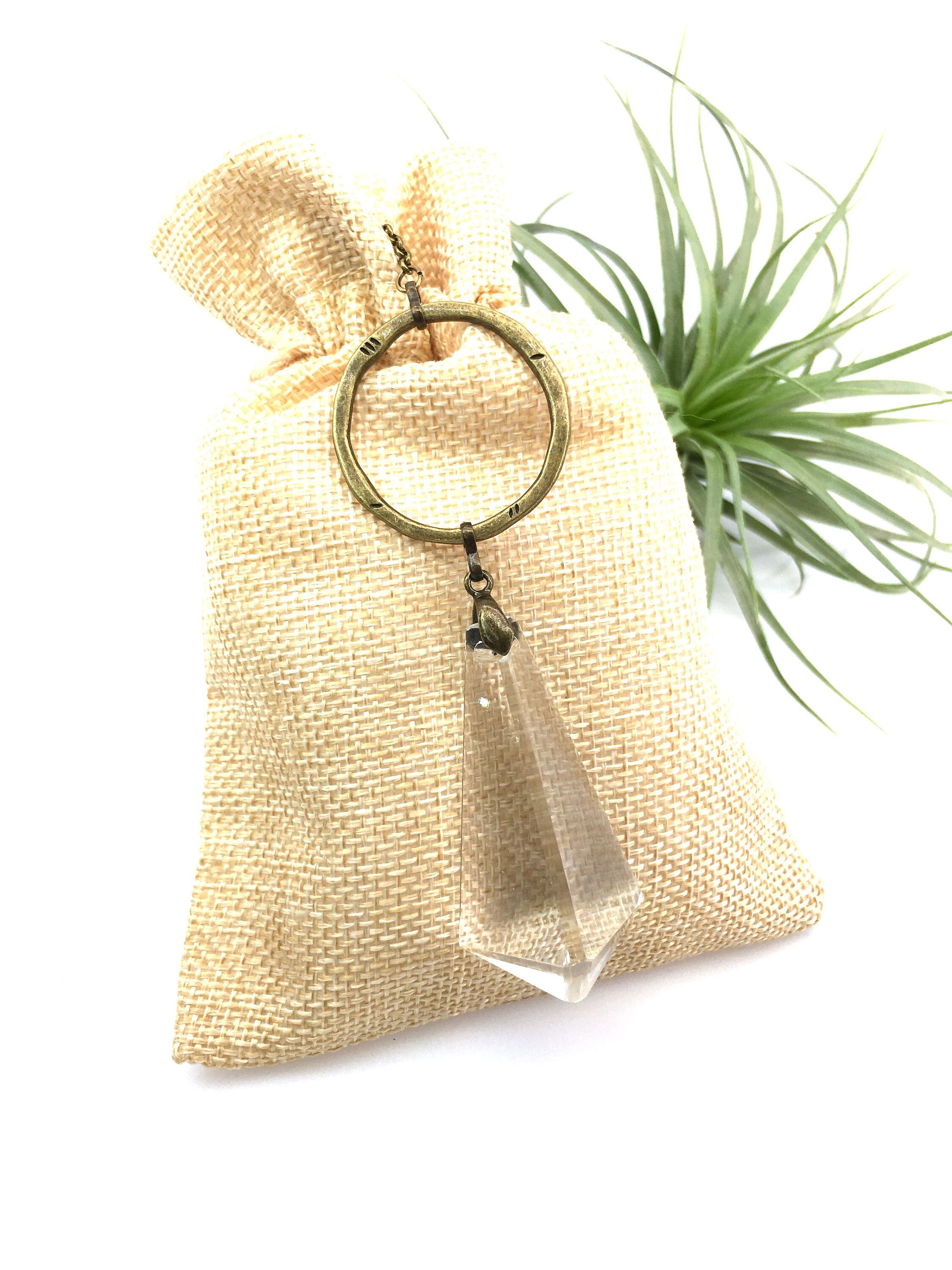 Adorn your living space with the charm of our handcrafted sun catcher, boasting a rare vintage French crystal chandelier prism renowned for its exceptional clarity. This elegant piece is designed with a lovely shape and features simple, textured bronze links that add a touch of sophistication.